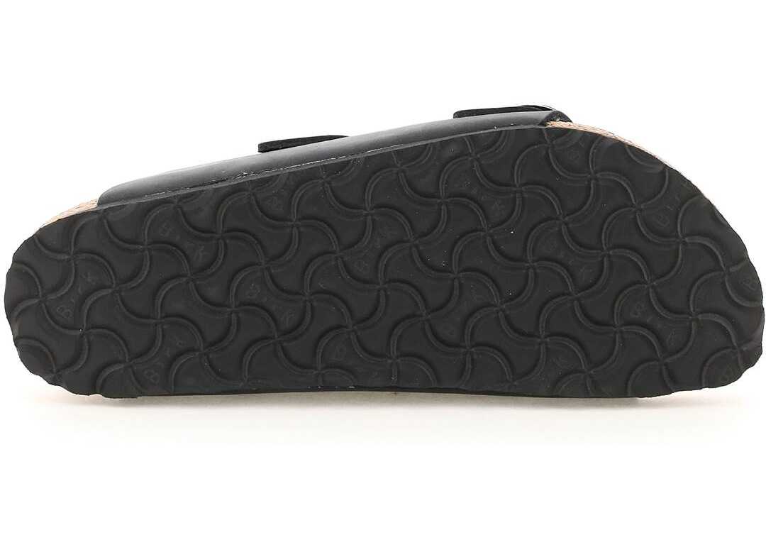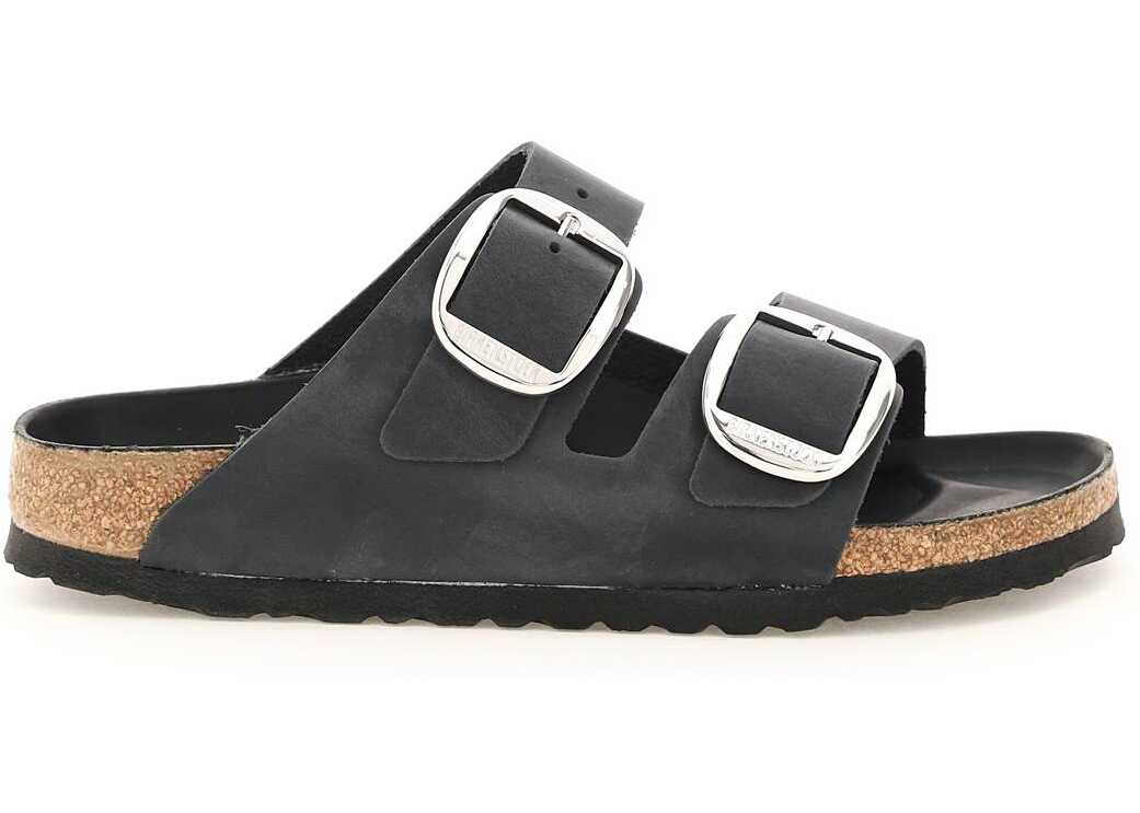 BIRKENSTOCK Arizona slides crafted in oiled nabuck leather featuring double adjustable strap with oversize silver-finished metal buckle with debossed logo. Smooth leather footbed, moulded cork and latex sole and EVA tread. Narrow fit.