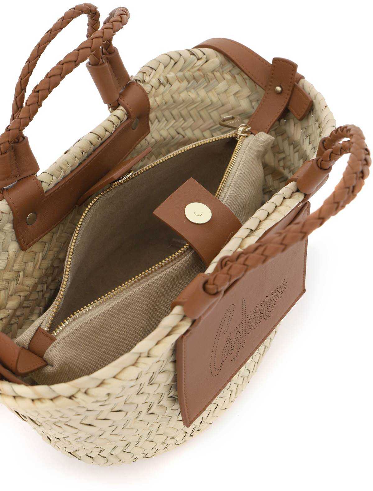 The Panier Bag by Castaner is made of woven raffia with handles and a front pocket decorated with a perforated leather logo. The interior features a removable canvas pouch, a detachable shoulder strap, and gold-finished metal accessories.