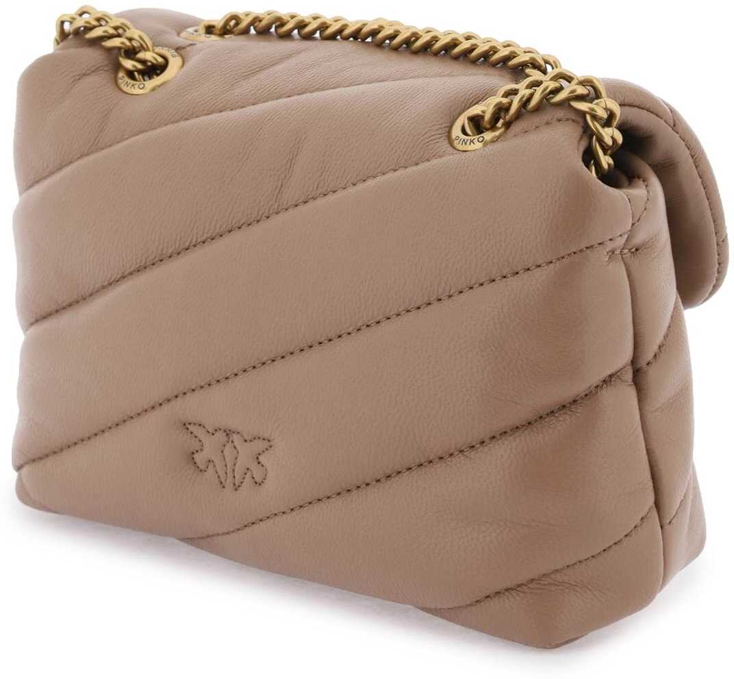 Pinko Love Baby Puff bag in soft quilted nappa leather characterized by the oblique stitching and the flap with the iconic metal buckle with Love Birds logo. Chain shoulder strap, magnetic closure and back Birds embroidery. Microfibre lining with one zippered flat pocket. Antique gold finished metalware.