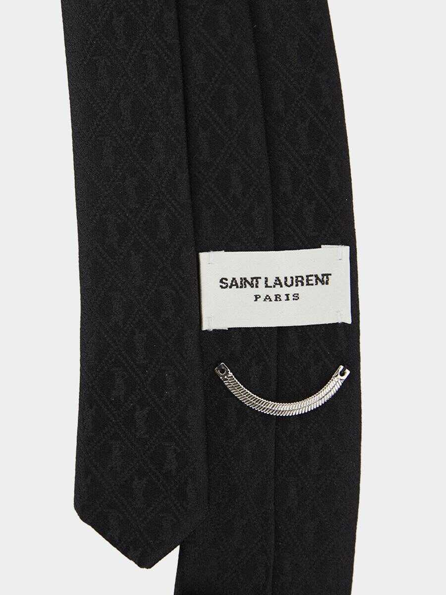 Narrow tie in black silk jacquard with all-over YSL monogram. Metal chain keeper loop.