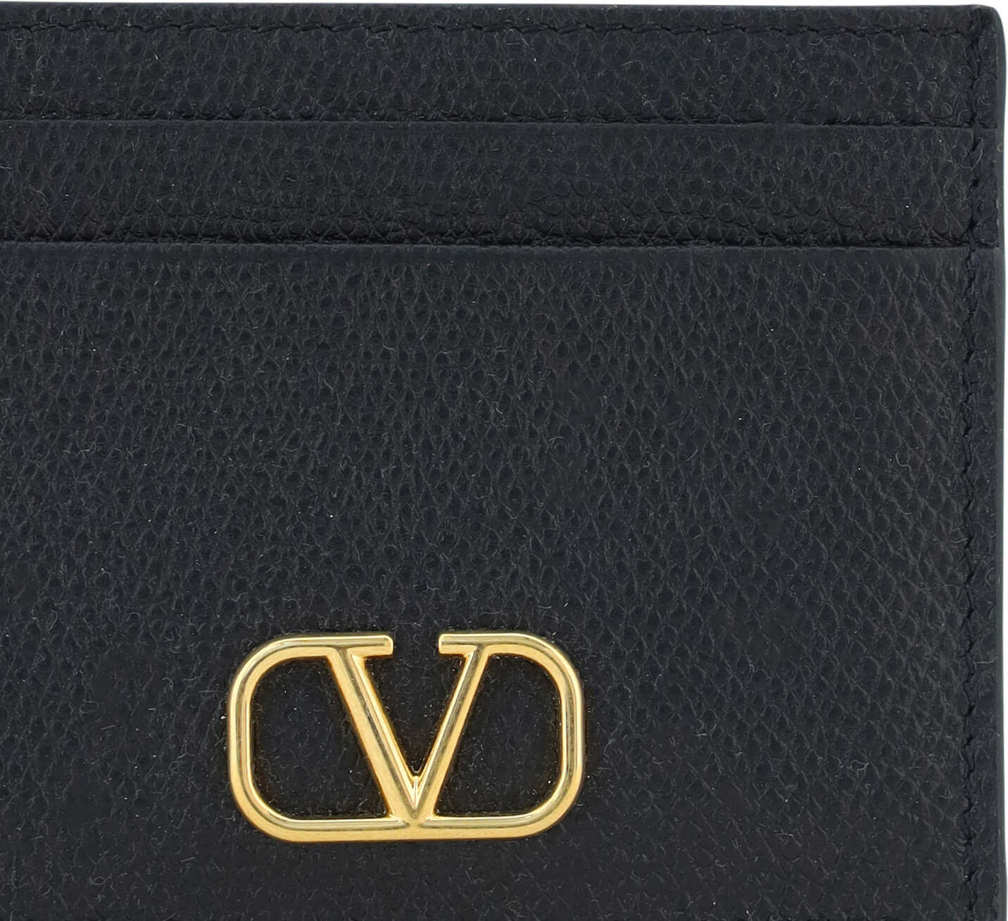 Calfskin VLogo Card Holder by Valentino Garavani, grained leather design, card slots on front and back, iconic contrasting applied VLogo plaque on front.