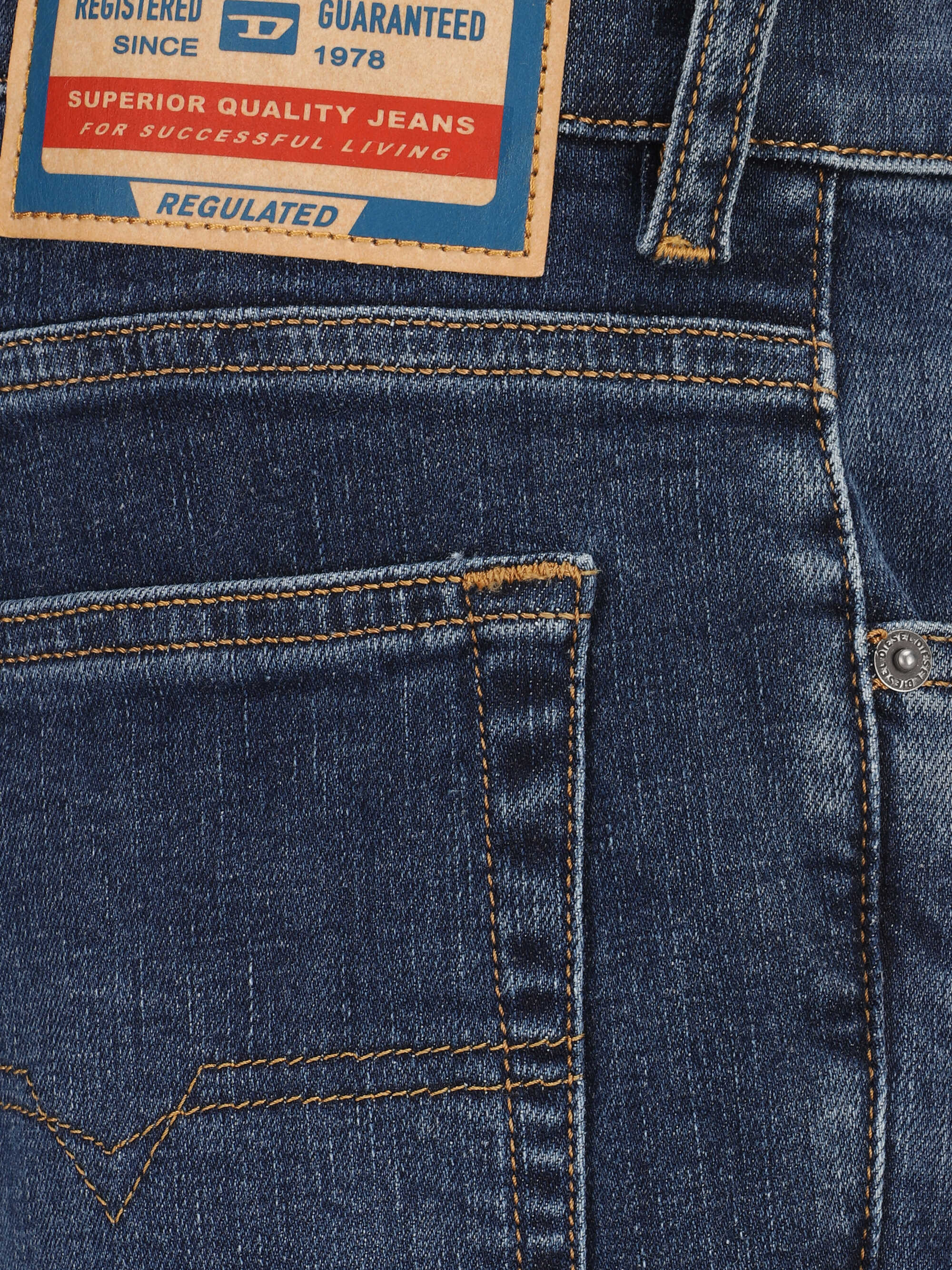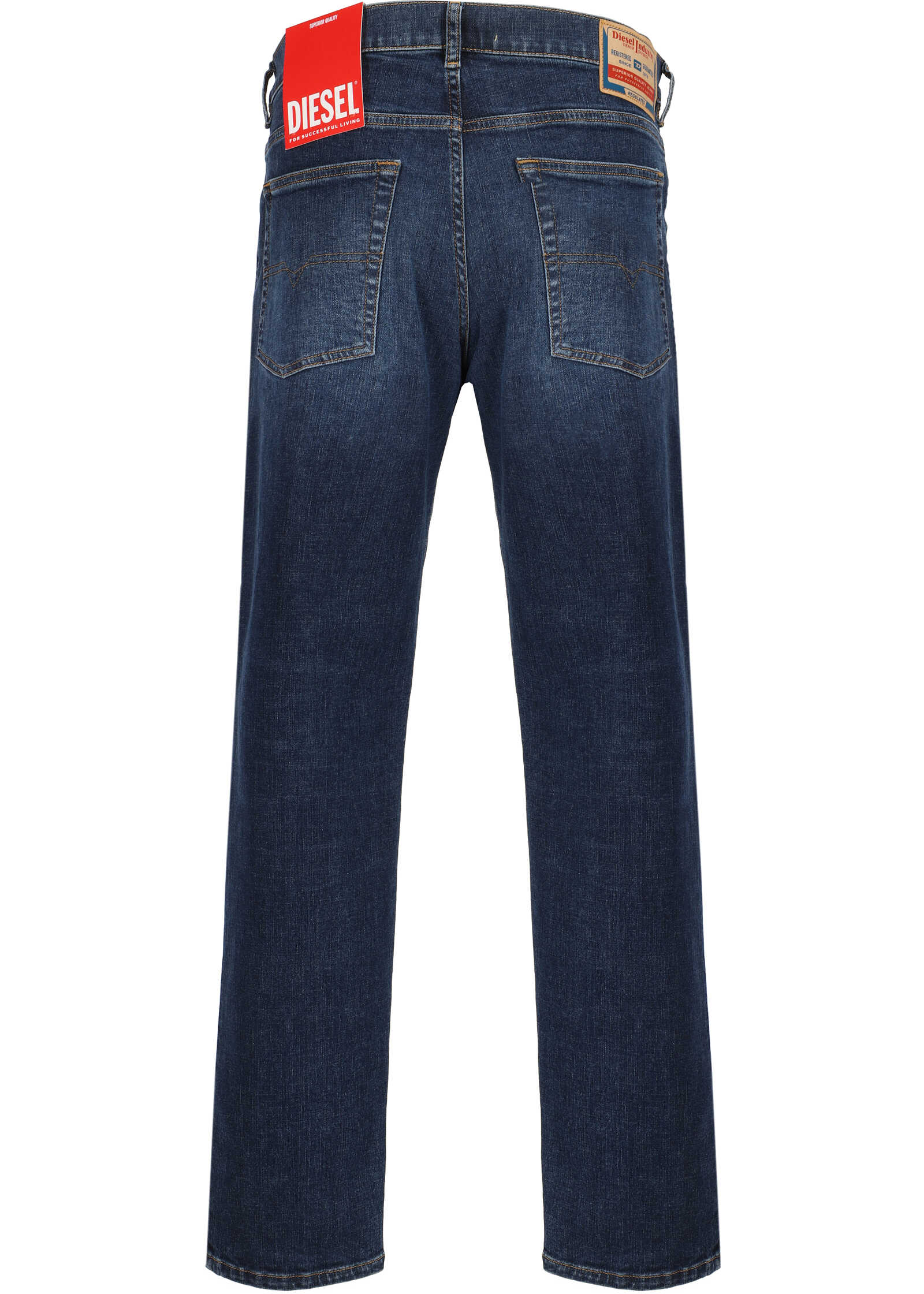 Cotton 2023 D-finitive Jeans by Diesel, five-pocket design, front button and zipper closure, belt loops for waistband, iconic branded signature leather pressure-printed patch applied at back.