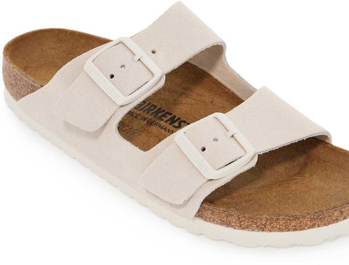 The Birkenstock Arizona slides are made of suede leather with a double adjustable strap and a matte tone-on-tone metal buckle featuring an embossed logo. The insole is also made of suede leather, while the anatomical cork and latex sole provides comfort and support. The outsole is made of EVA for durability. These slides have a narrow fit.