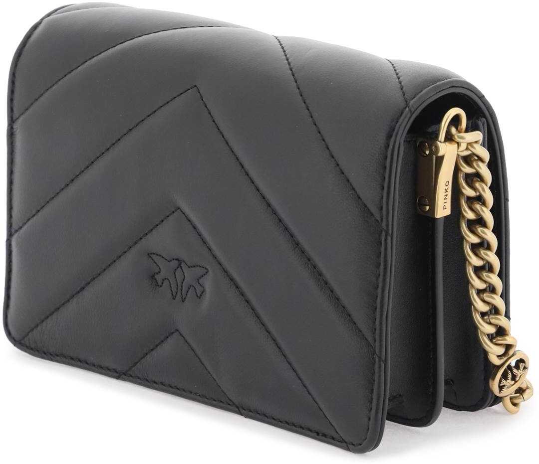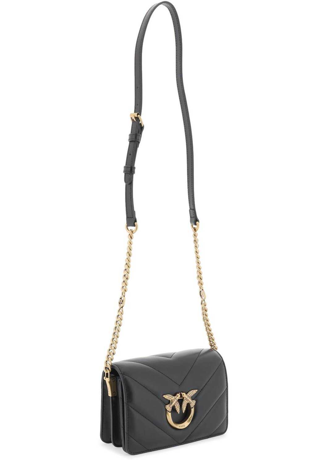 Mini Love Bag Click by Pinko in quilted nappa leather with big chevron pattern and iconic Love Birds Diamond Cut metal buckle on flap. Magnetic closure, suede microfiber lined interior with zippered partition and flat leather pocket. Adjustable chain and leather shoulder strap, gold-finished metalware.