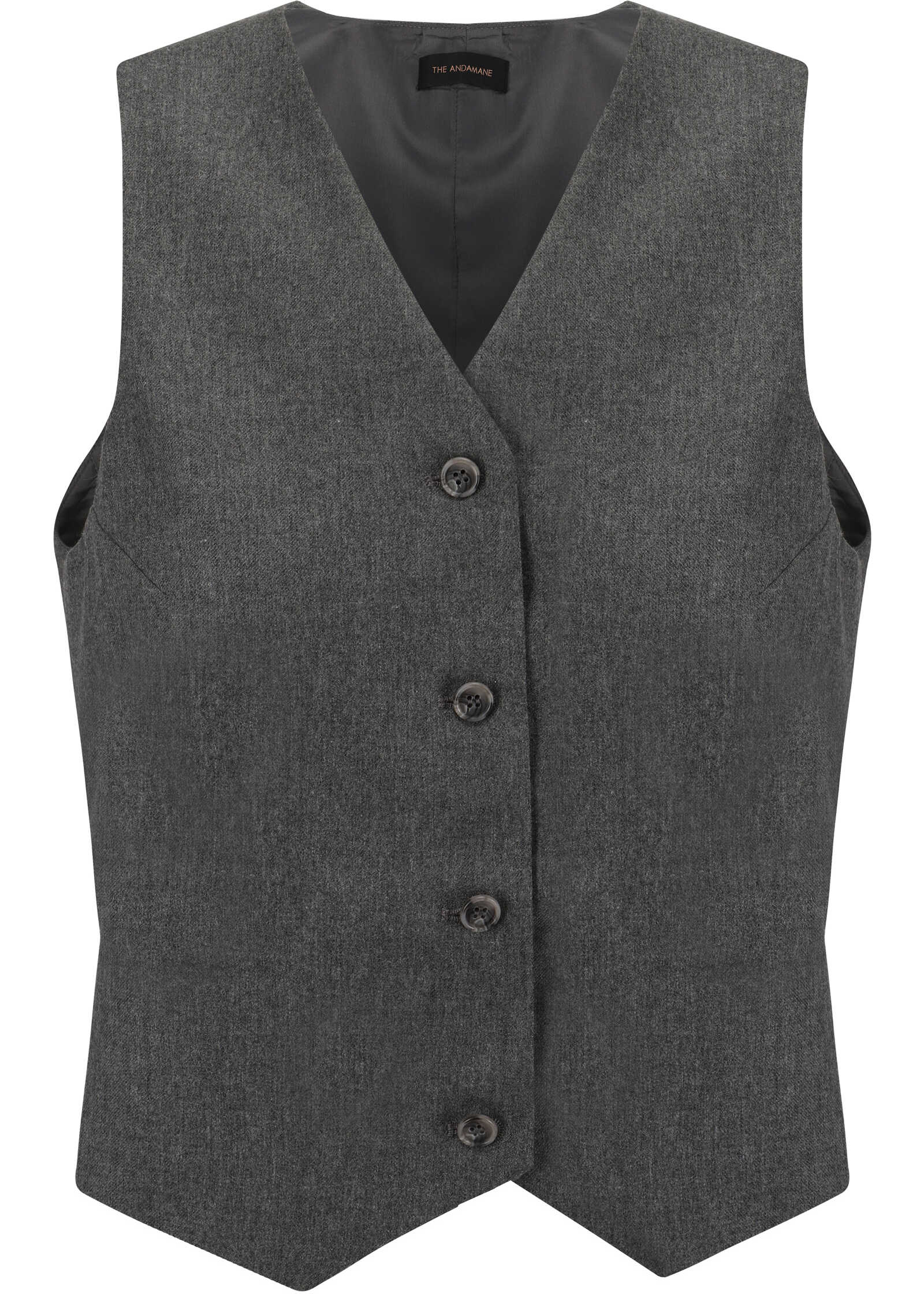 Pauline Vest by The Andamane, V-neck front, button front closure, mélange pattern, adjustable martingale pattern strap on back panel, regular fit.