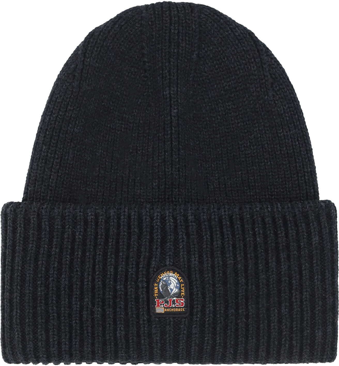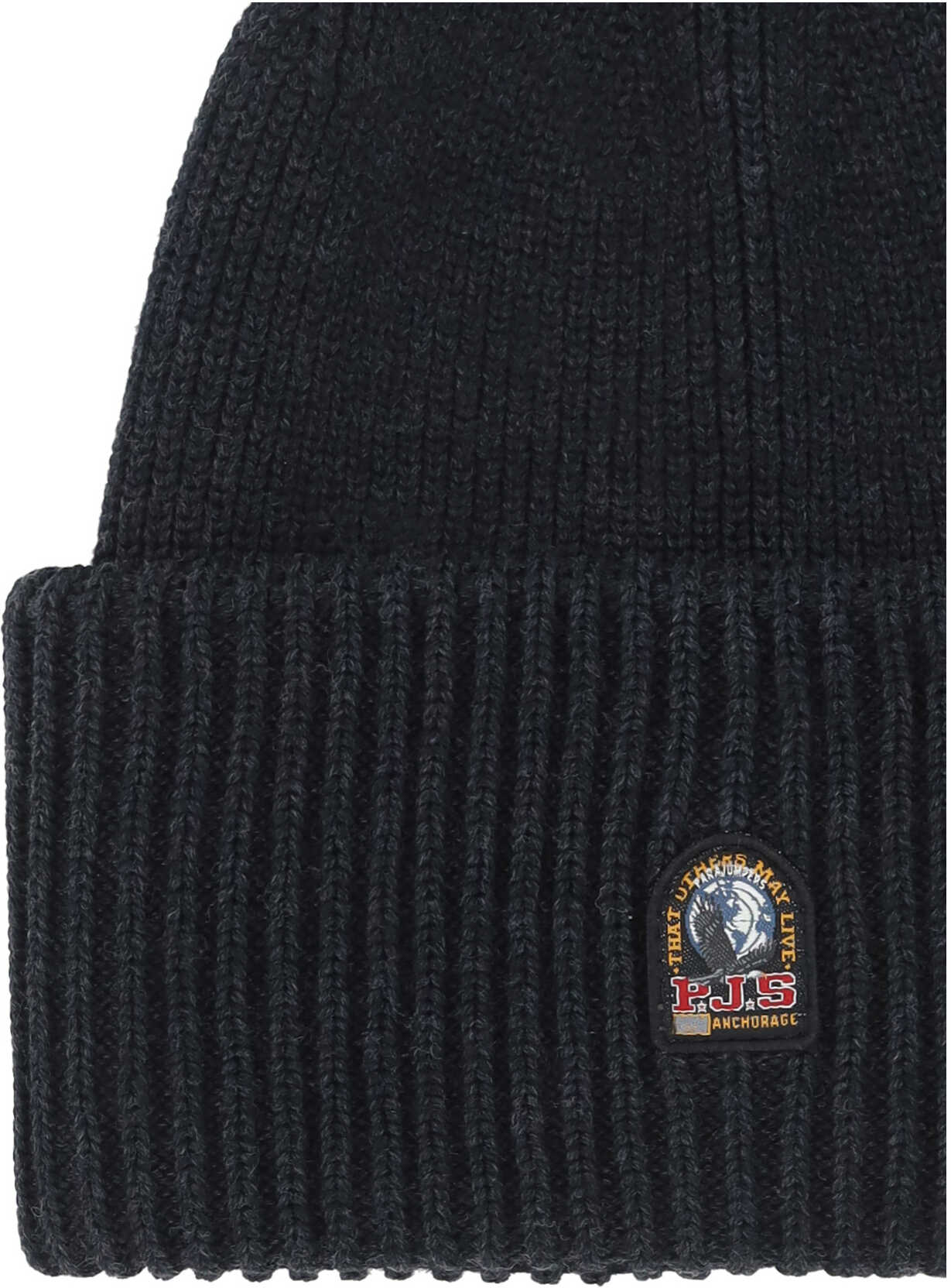 Virgin Wool Beanie Hat by Parajumpers, ribbed design, contrasting embroidered iconic brand logo patch on lapel.