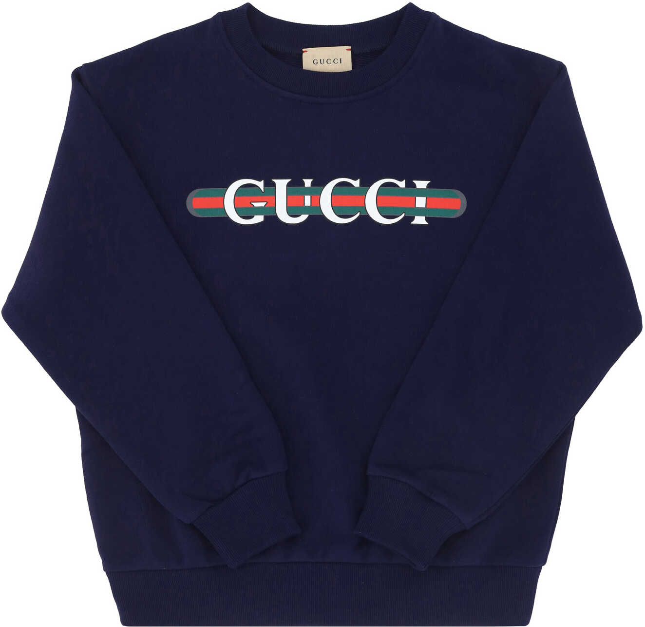 Cotton Sweatshirt for Boy by Gucci features ribbed crew neck, ribbed cuffs, ribbed hem, graphics and iconic contrasting brand logo on front.