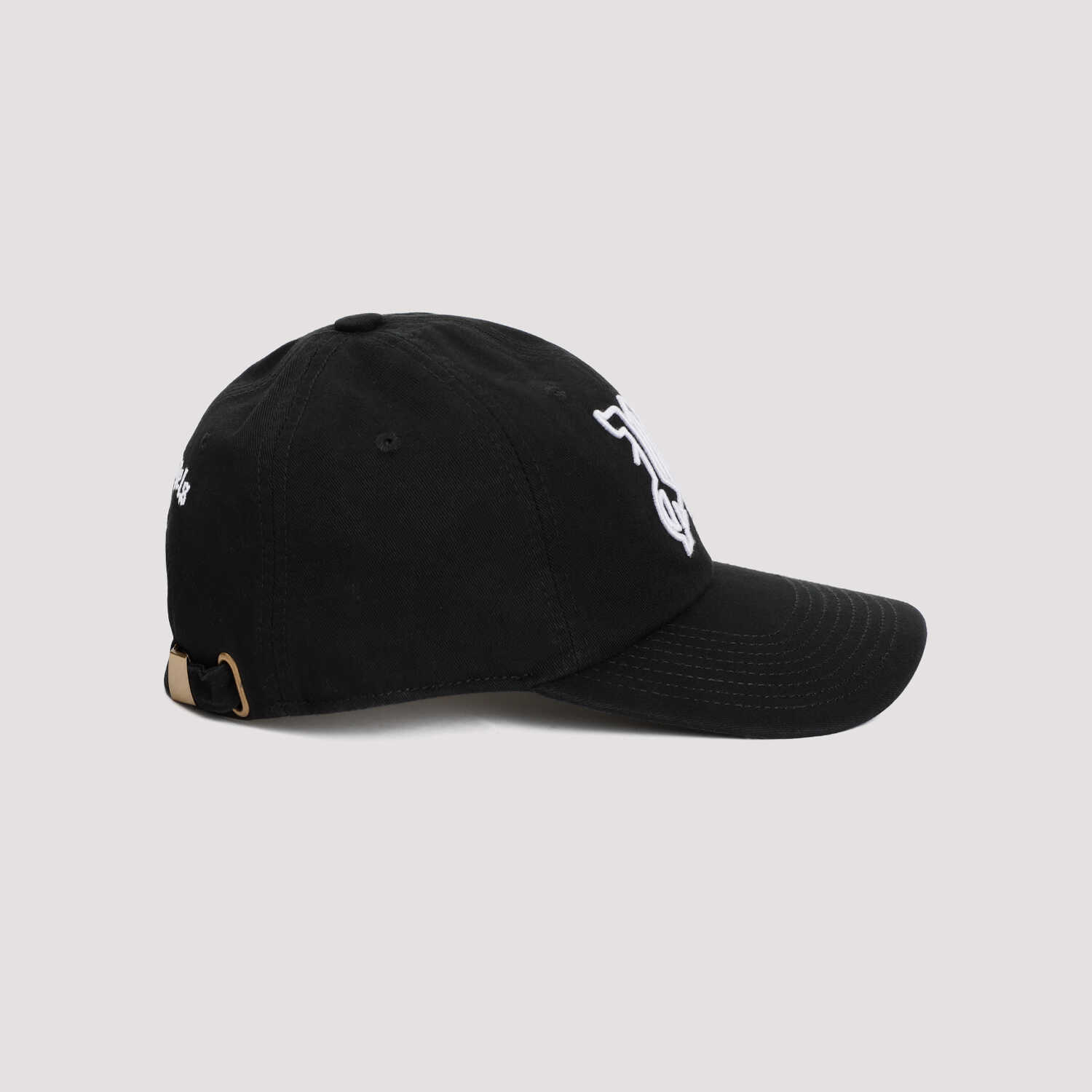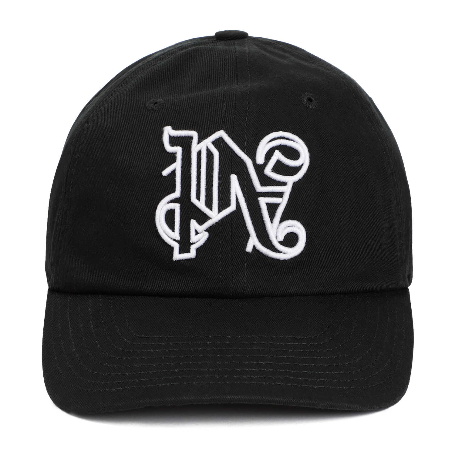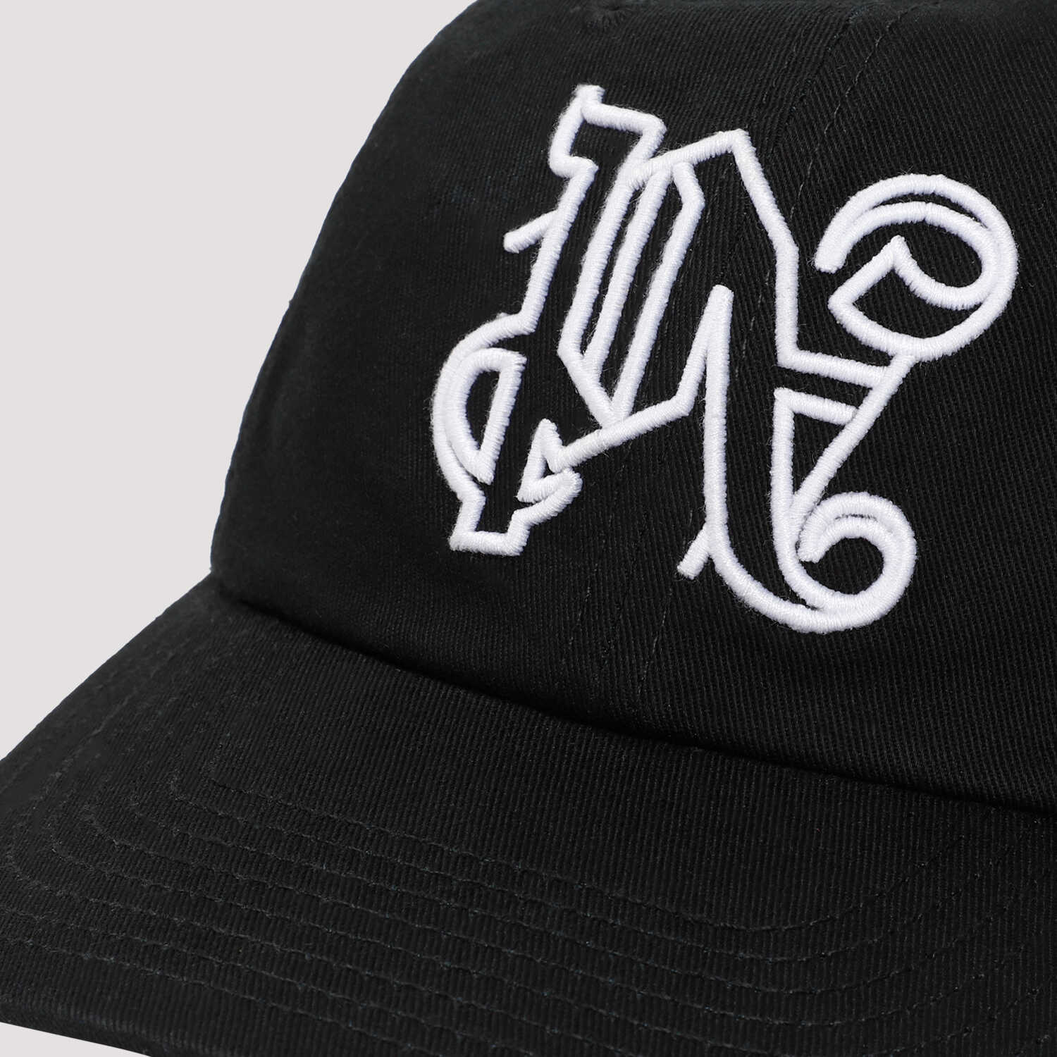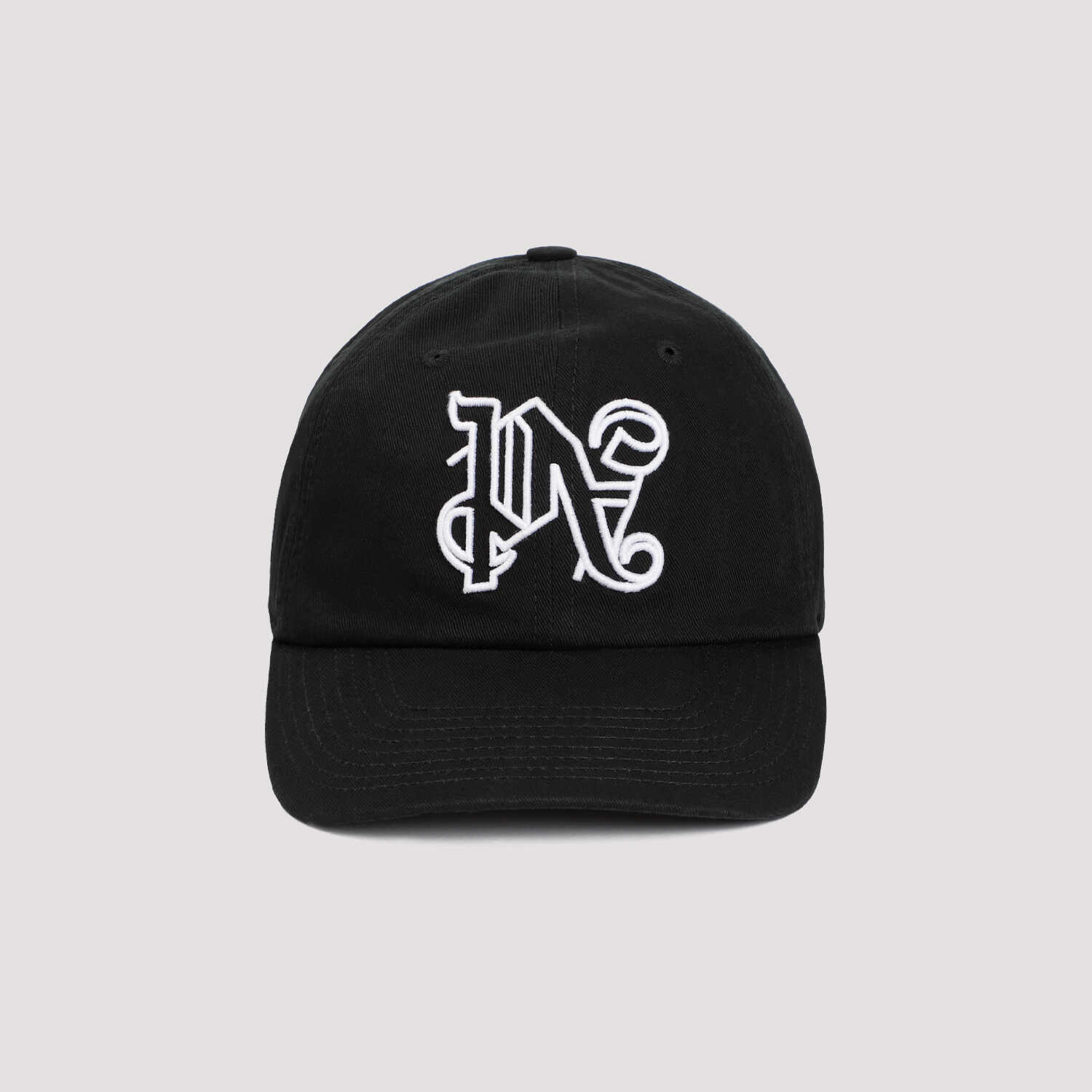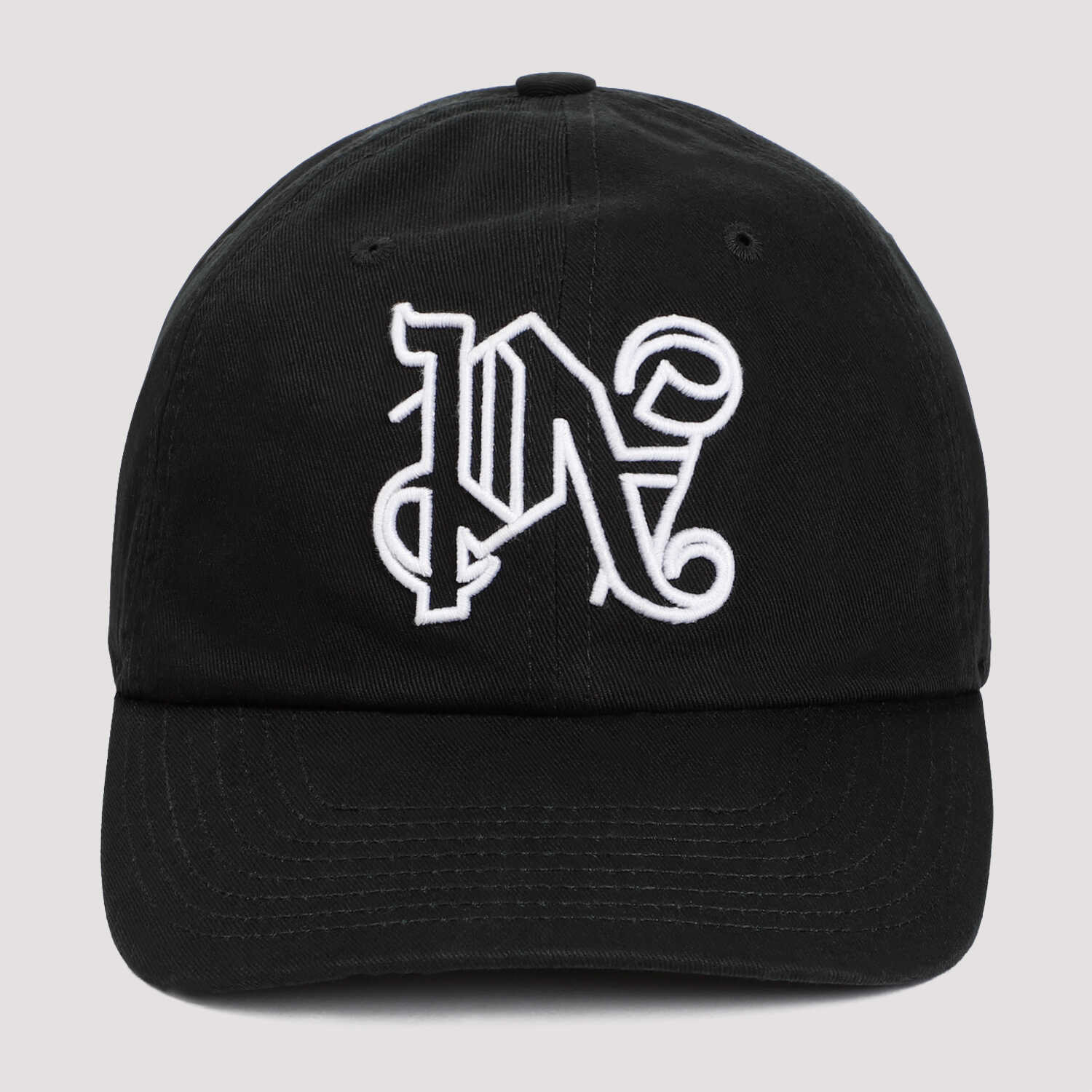 Palm Angels Black Cotton Logo cap. Black cotton, 6-panel construction, tonal visor, front Monogram logo in contrasting white, adjustable strap on back.