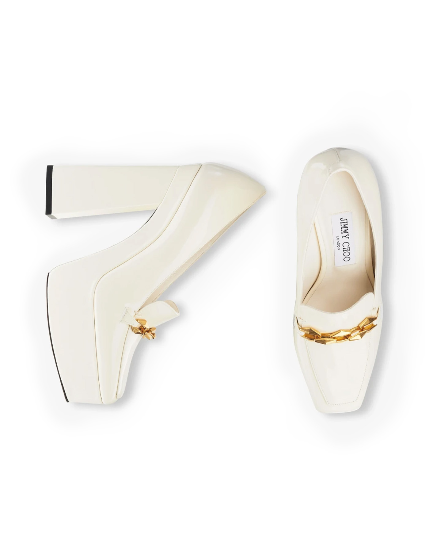Diamond Tilda 140 pumps in white patent leather with platform. They feature gold-tone metal chain detail at front, Jimmy Choo label on the insole, block heel and leather and suede sole.