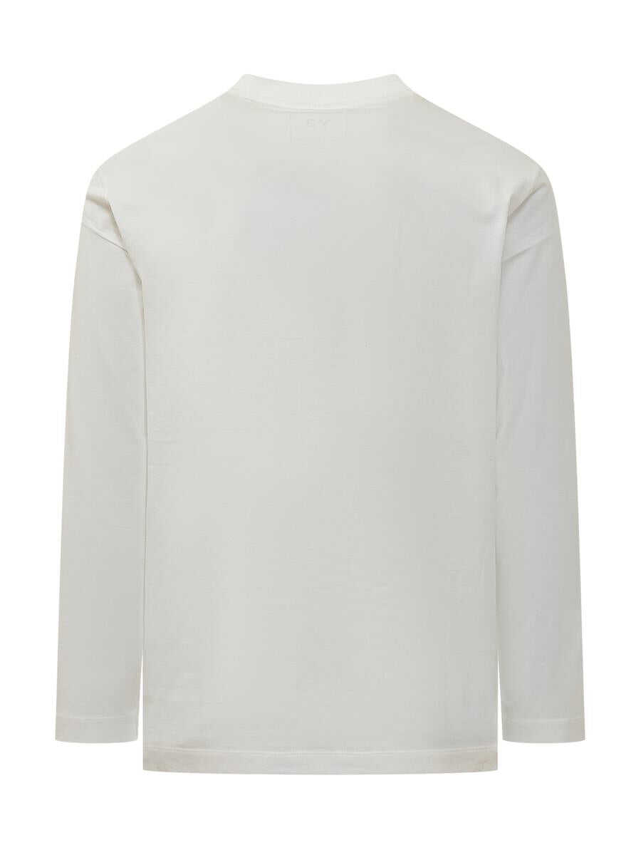 White cotton T-shirt. Long sleeves. Crew neck. Logo printed on the front.