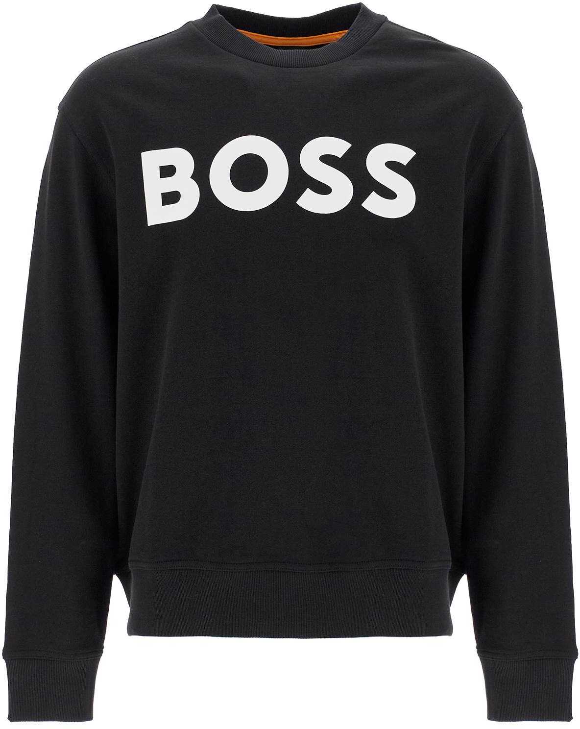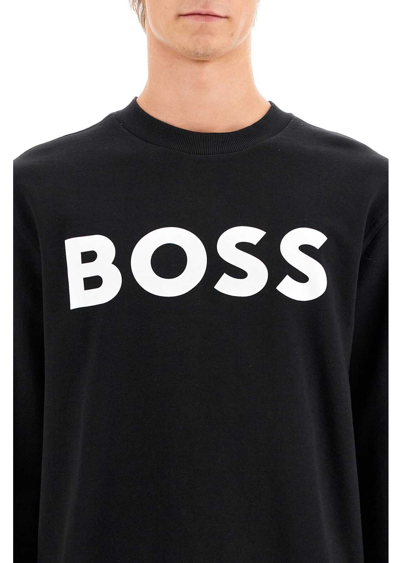 Boss crew neck sweatshirt with large printed logo on the front. Made of medium weight brushed cotton jersey, it has a classic design with ribbed edges and a regular fit. The model is 187 cm tall and wears size L.
