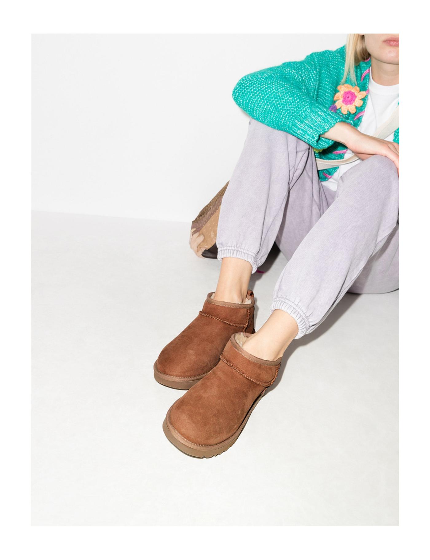 UGG’s iconic Classic Mini boots were originally popular amongst surfers as protective after-session footwear, due to their fully lined interior and practical slip-on style. Maintaining the same comfort-centric design, the pair is presented here in brown-hued sheepskin.