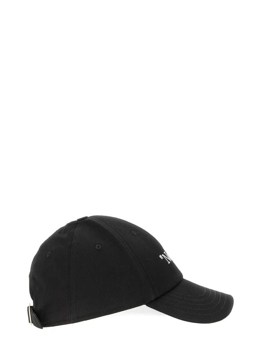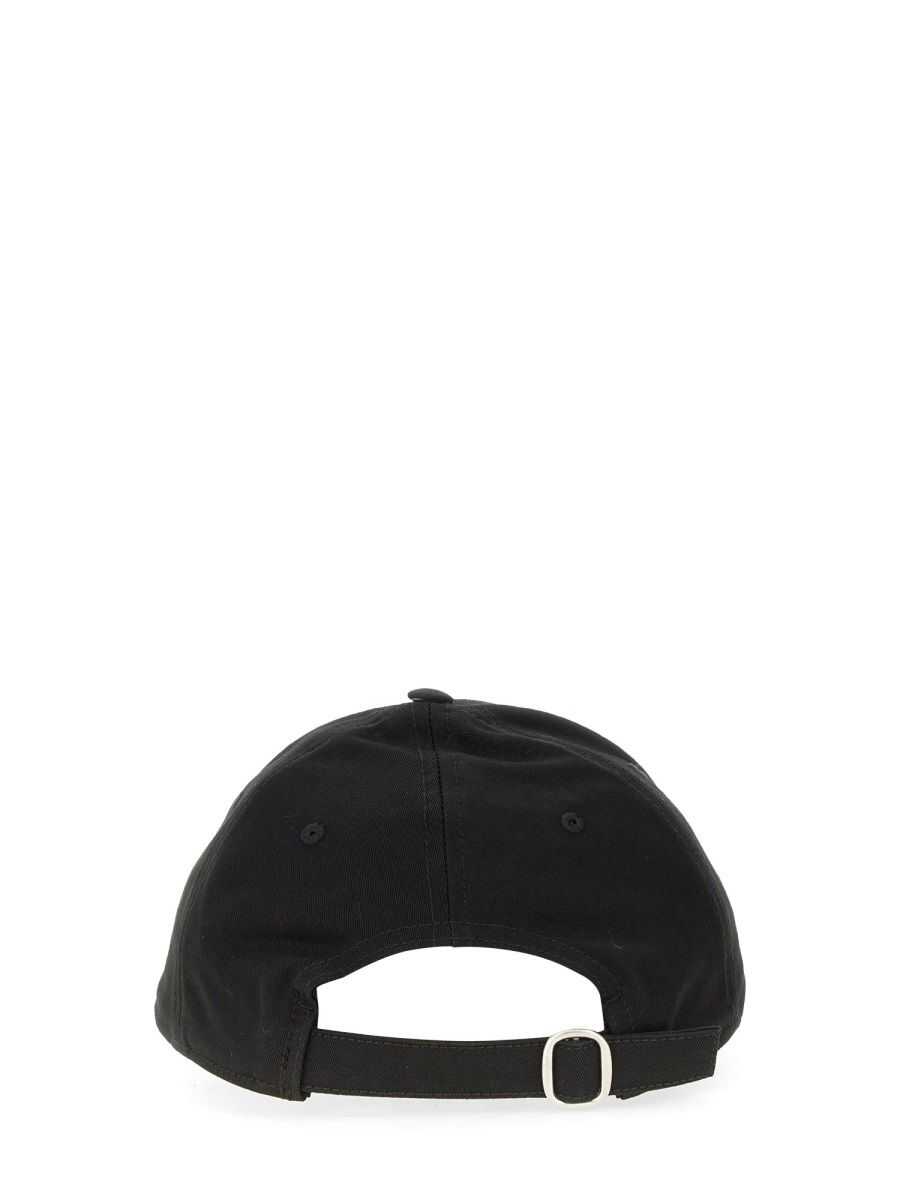 Black cotton twill weave six-panel construction embroidered motif curved peak adjustable strap to the rear