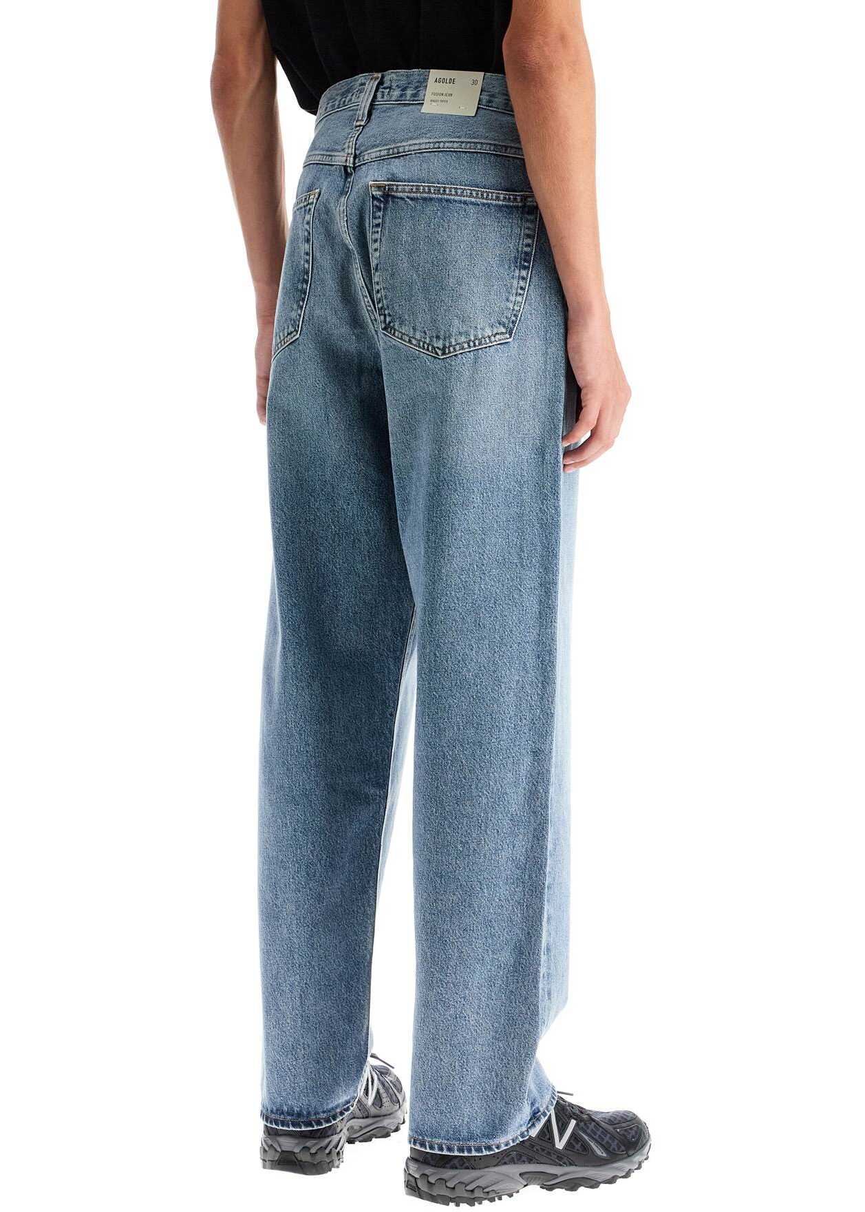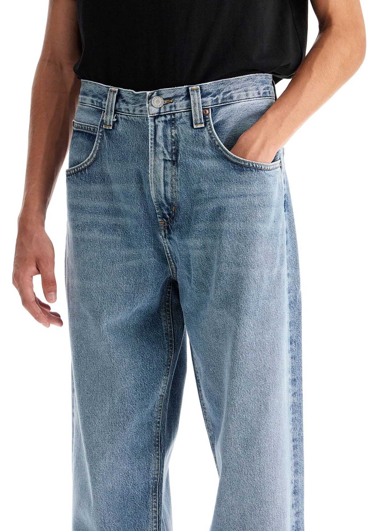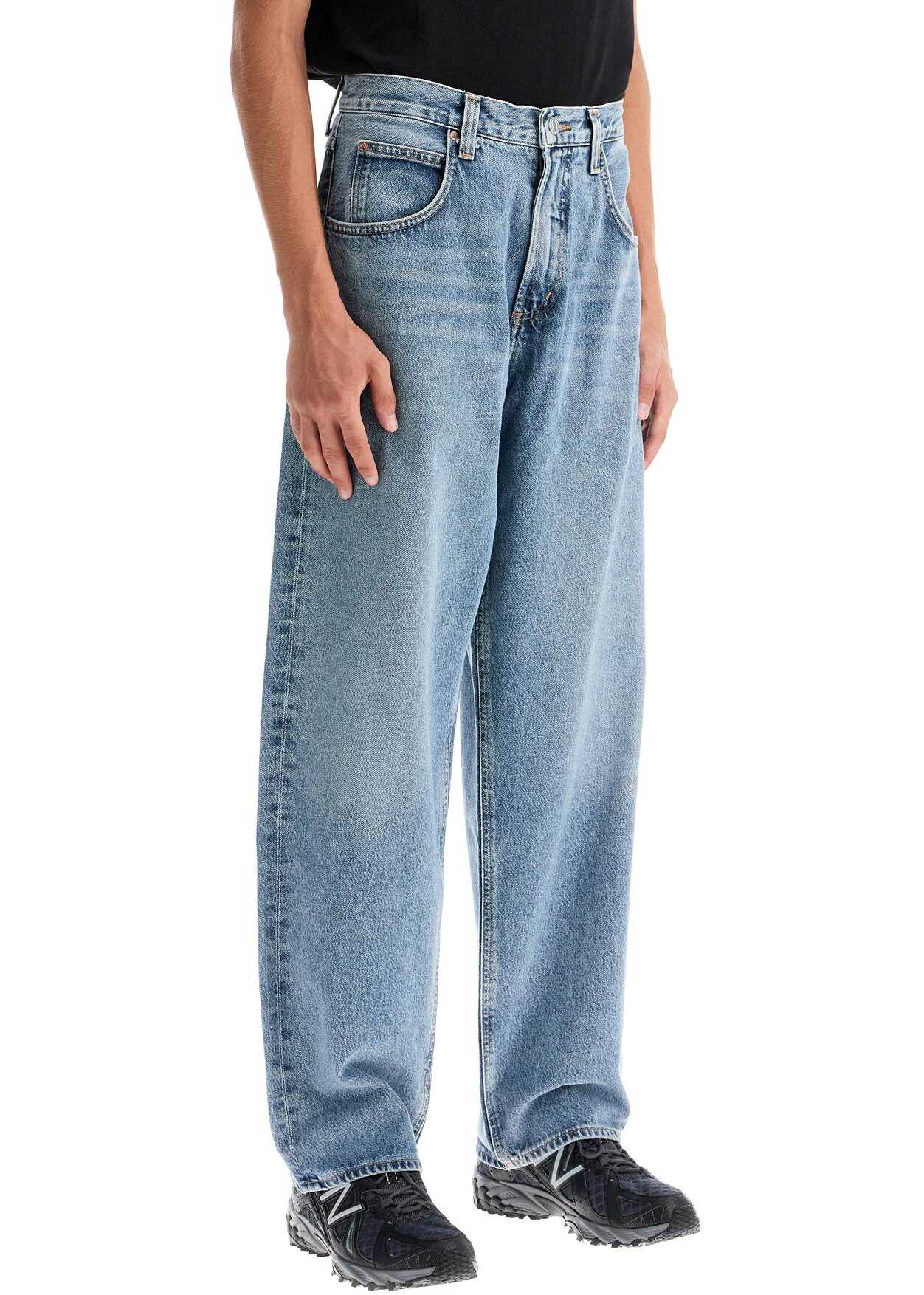 The Agolde five-pocket jeans are made from regenerative cotton denim with a vintage-inspired Ratio wash. The fit is baggy with a low waist and slightly tapered cut. The garment features spacious pockets, belt loops, and a zip and logo button closure. The model is 187 cm tall and wears size 30.