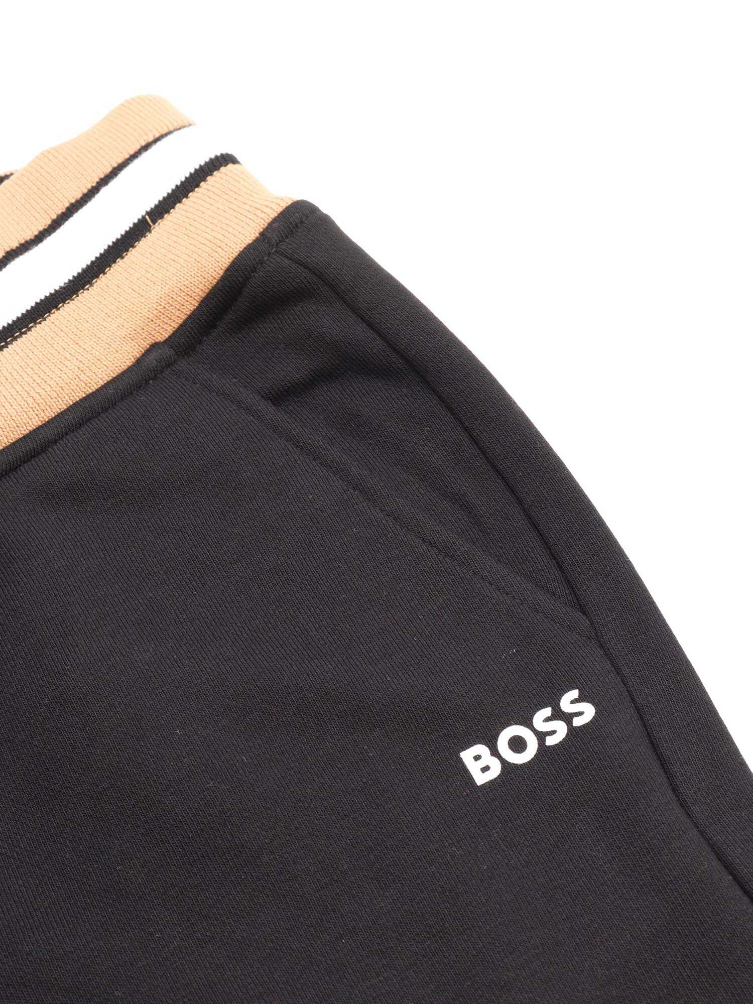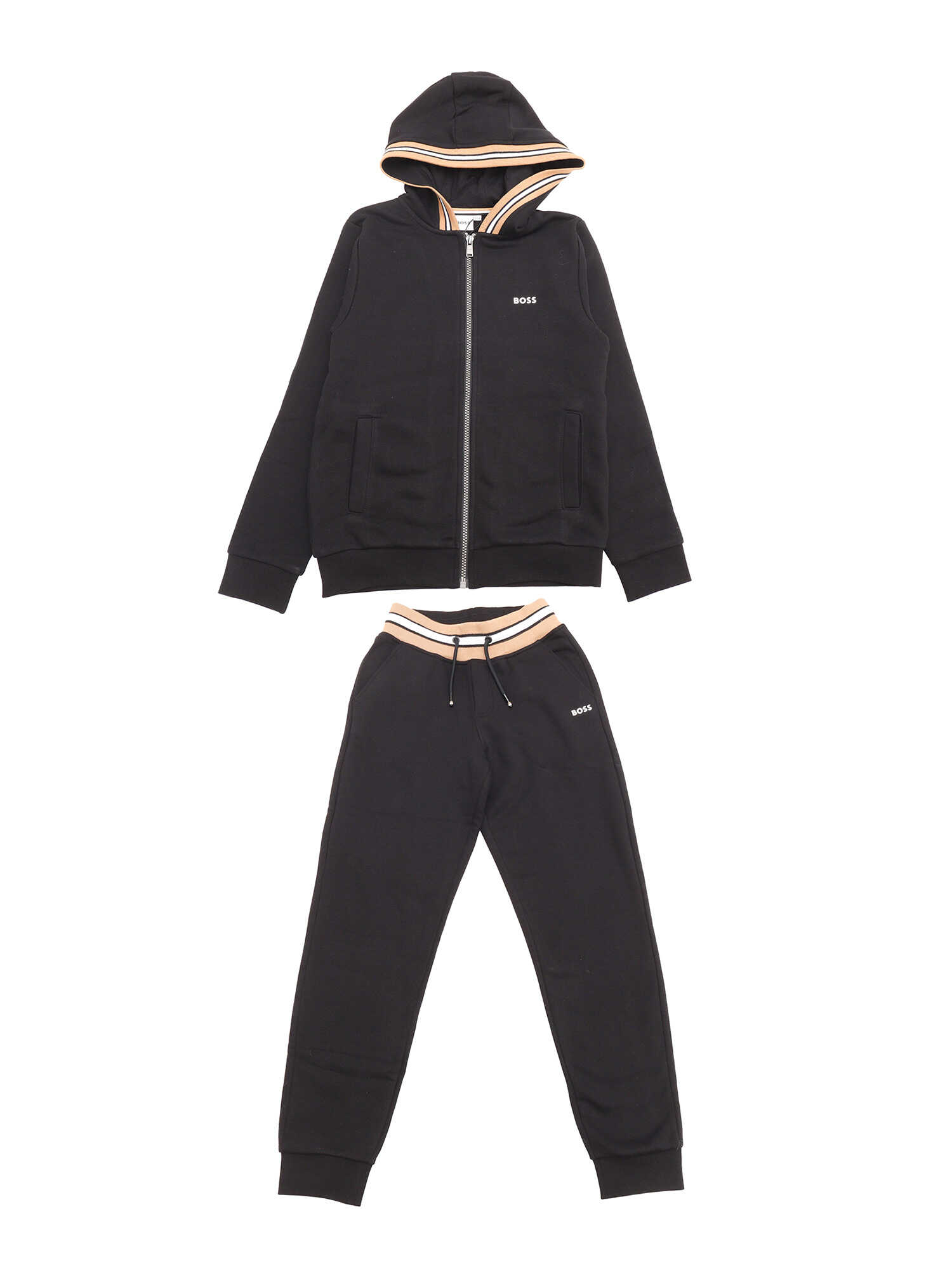 Cardigan and trouser jogging set. Cardigan with hood in brushed cotton polyester fleece, side pockets, zip fastening at front, rib in iconic colours on hood, "BOSS" print on chest. Jogging trousers in brushed cotton polyester fleece, elasticated waistband in iconic colours with drawstring, "BOSS" logo printed on leg, side pockets. ALSO EXIST SEPARATE (J51120+J51151)