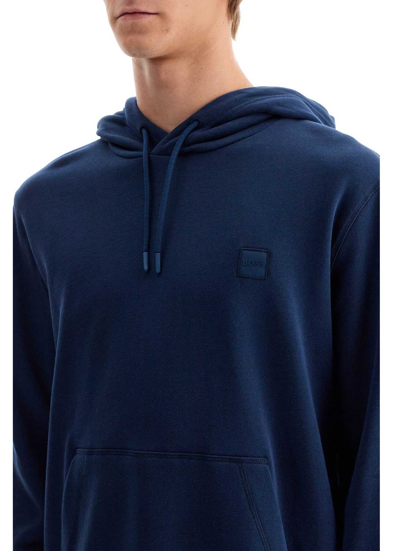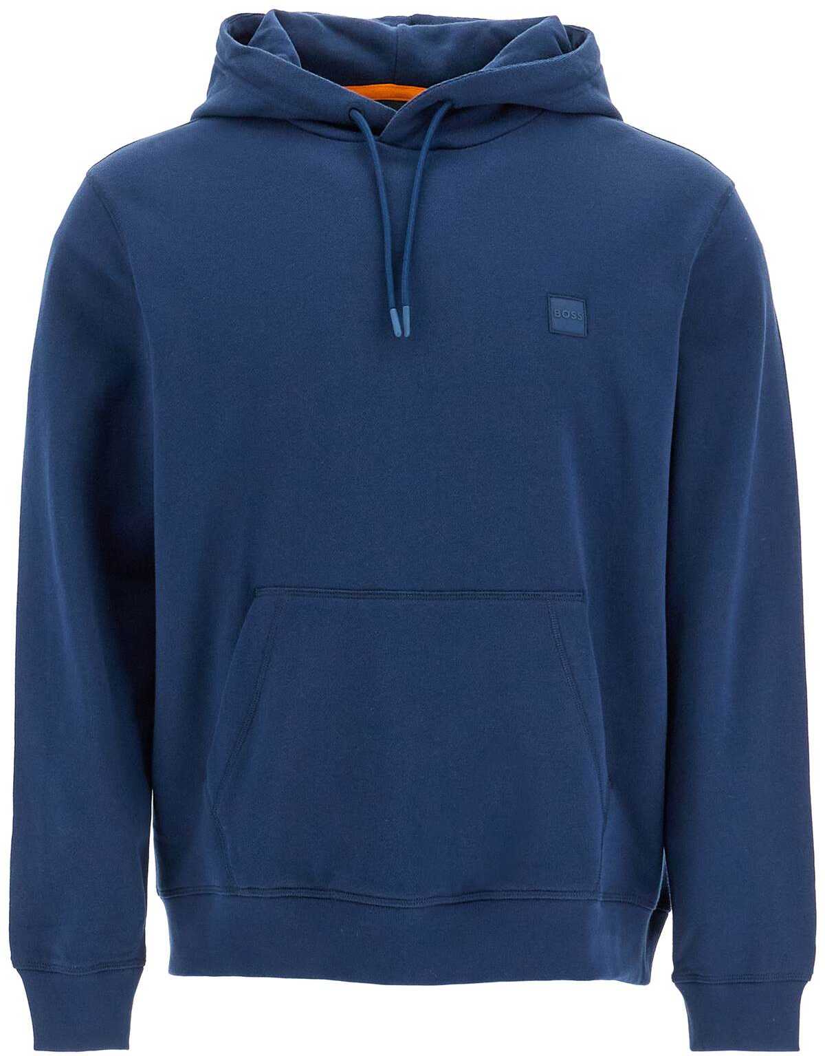 The Wetalk sweatshirt by BOSS is made of brushed cotton jersey with a tone-on-tone logo patch applied on the chest. It features a drawstring hood, kangaroo pocket, and a boxy fit. The model is 182 cm tall and wears size L.
