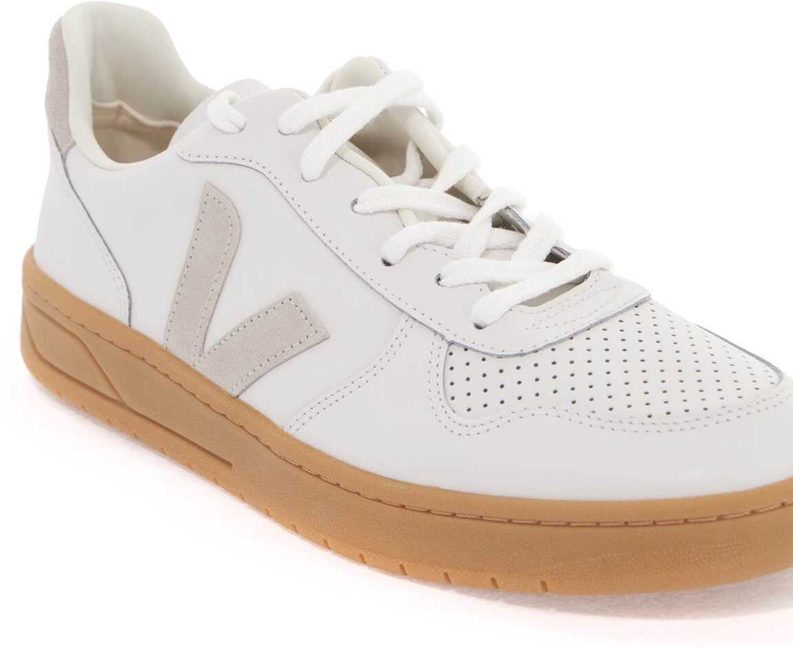The V-10 sneakers by Veja are made of Chromefree leather and feature side V logos and a contrasting suede leather spoiler with the brand's logo. The tongue is printed with the logo, while the interior is made of eco-friendly fabric and has a removable insole. The natural rubber sole comes from the Amazon rainforest.
