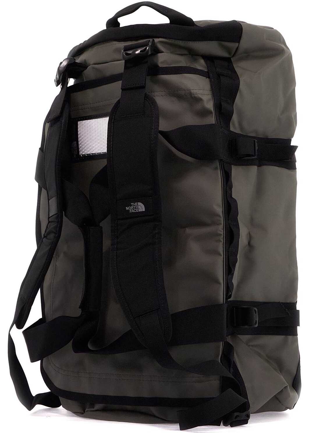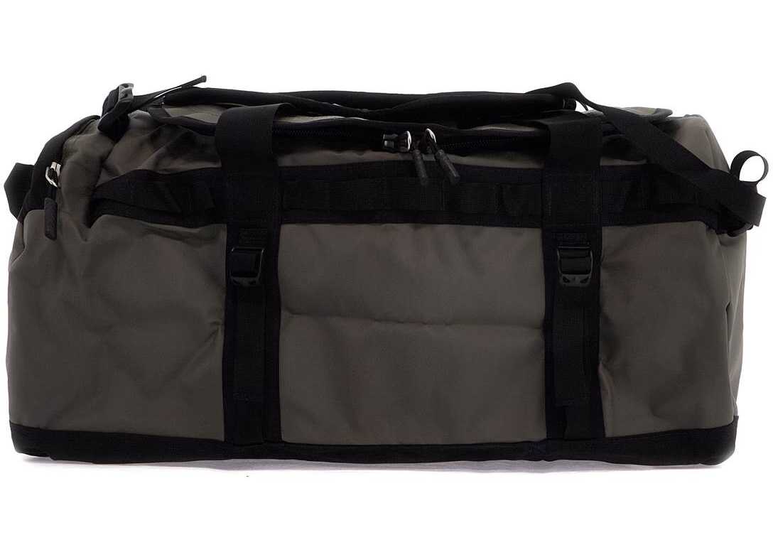 Base Camp duffel bag by The North Face made of water-resistant recycled materials featuring a two-way zippered closure. Unlined interior with a mesh pocket under the flap, side handles, compression straps, adjustable shoulder straps to wear it as a backpack, and transparent document pocket on top. Mesh bag included for easy storage.