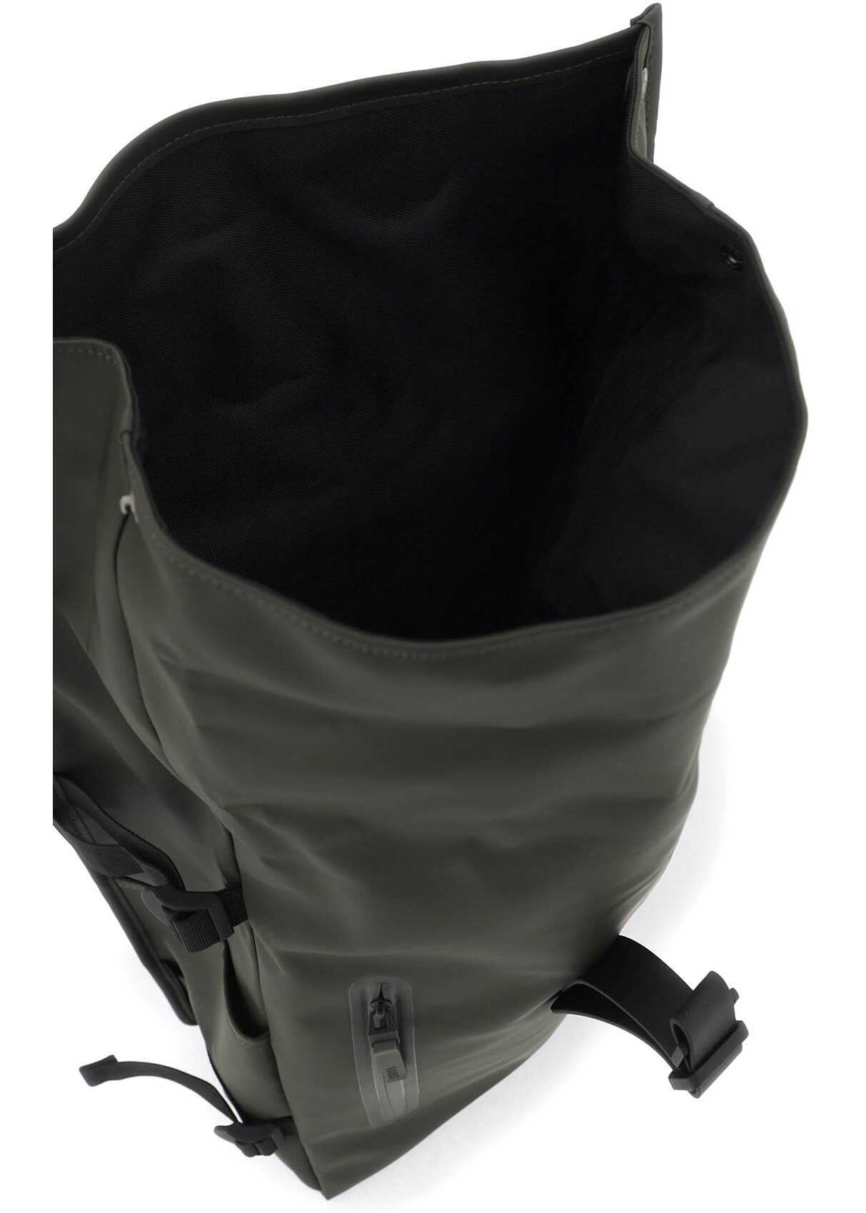 Rolltop Rucksack by RAINS in technical waterproof fabric featuring a rolltop closure with iconic lobster clasp. Lined interior, one inner pocket, one front zippered pocket and a side pocket for laptop (16 in). Adjustable padded shoulder strap, padded mesh back and top handle. Tone-on-tone metalware.