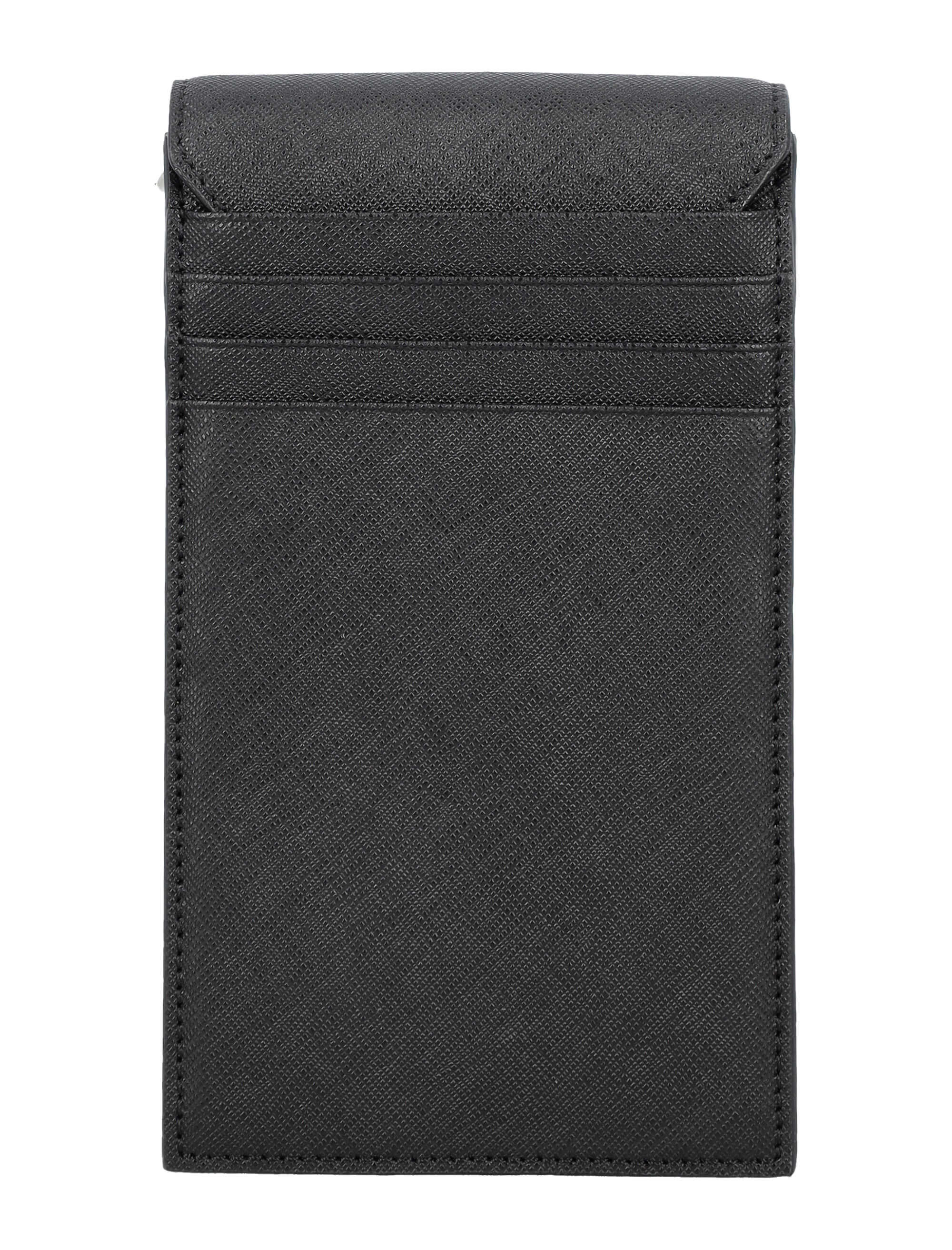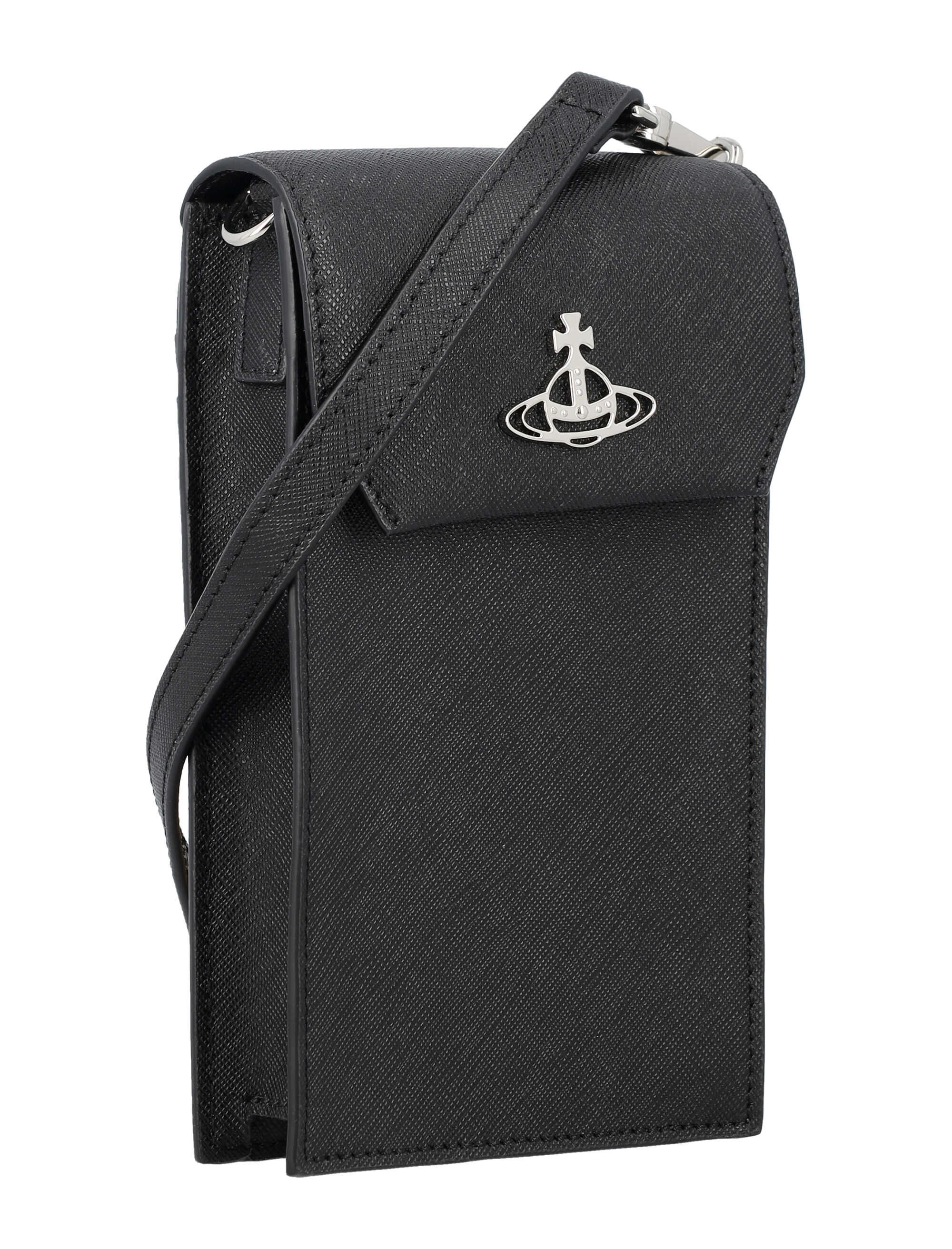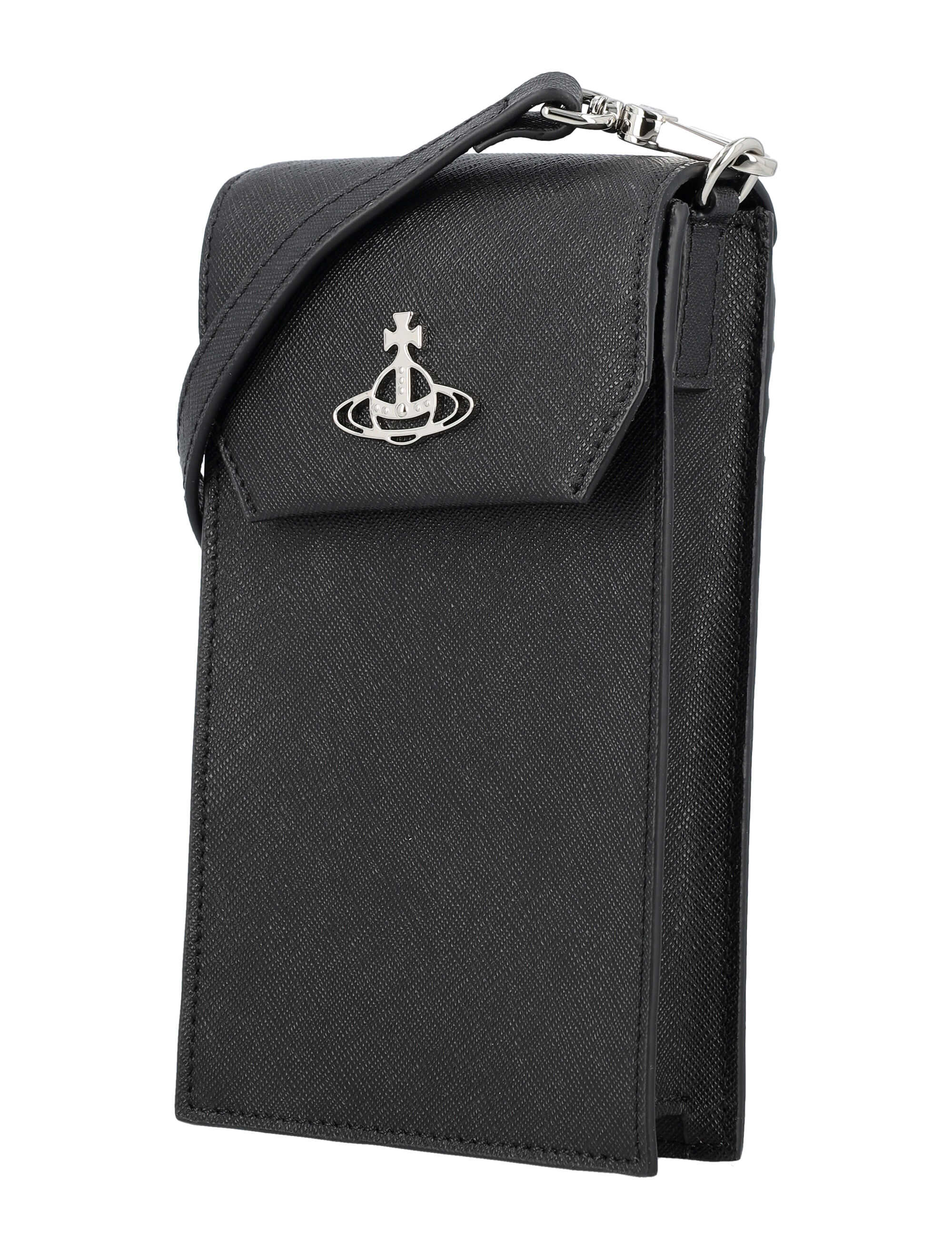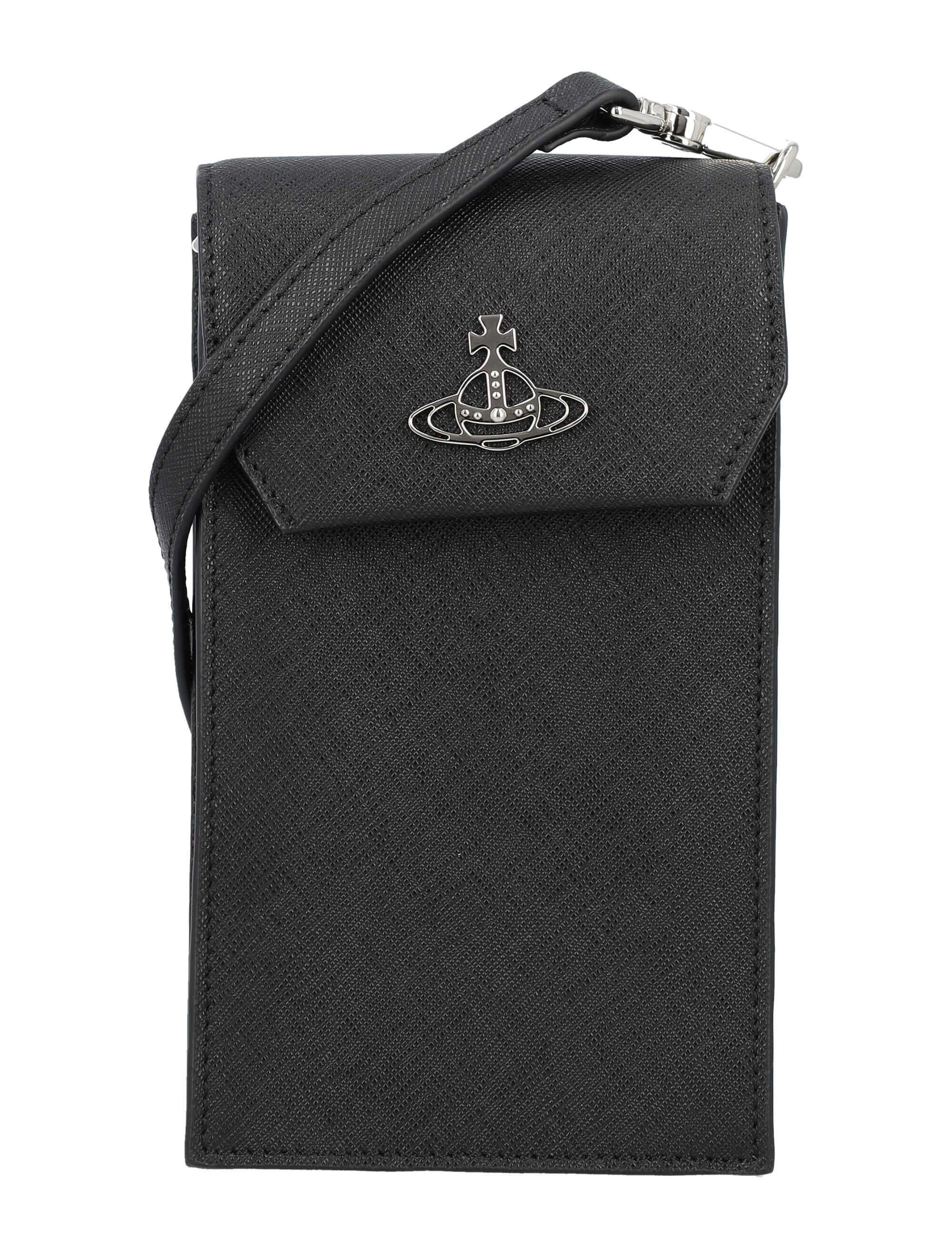 Elevate your style with this luxurious black phone bag by VIVIENNE WESTWOOD. Made from 100% cow leather, it features an iconic Orb emblem, adjustable shoulder strap, and multiple card slots. Stay organized and chic with this stylish accessory. Height: 17.5cm Width: 10.5cm Depth: 3cm. Make a statement with VIVIENNE WESTWOOD.