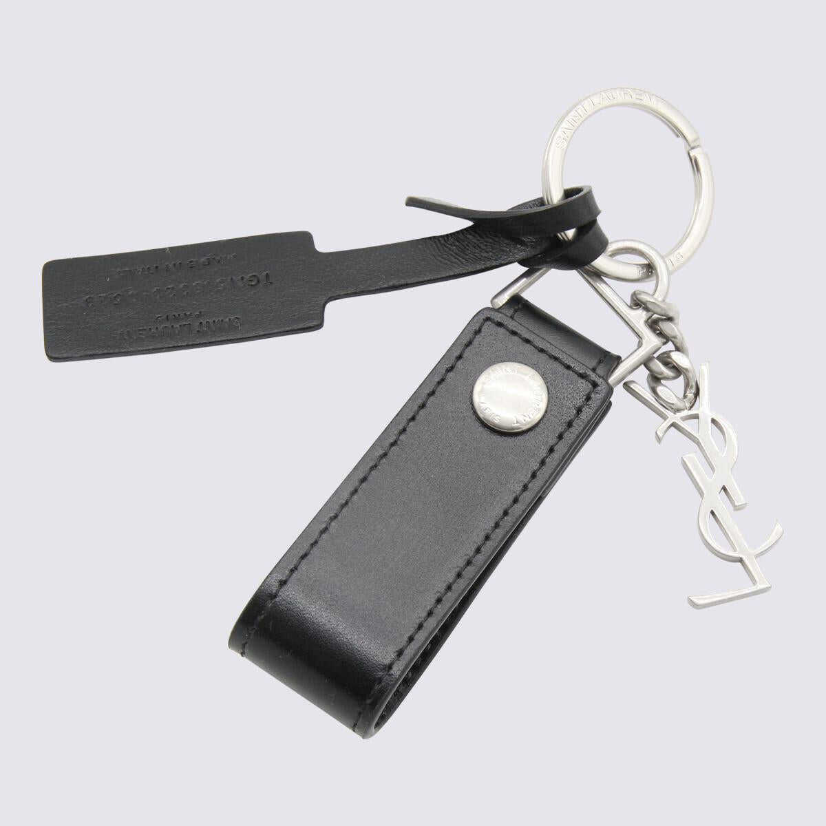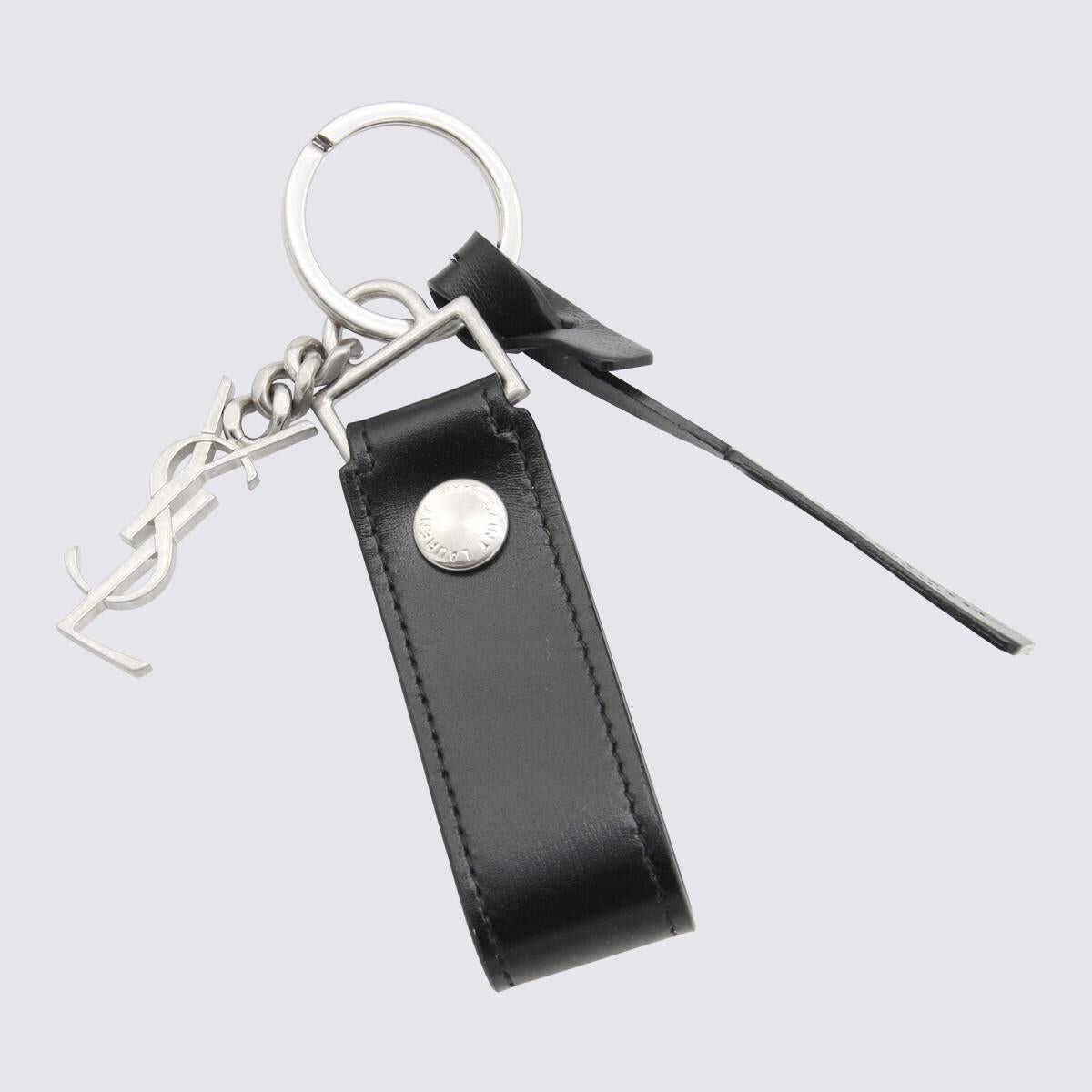 Black leather Cassandre keyring from Saint Laurent featuring silver tone metal finishes, YSL pendant charms and automatic button with engraved logo.