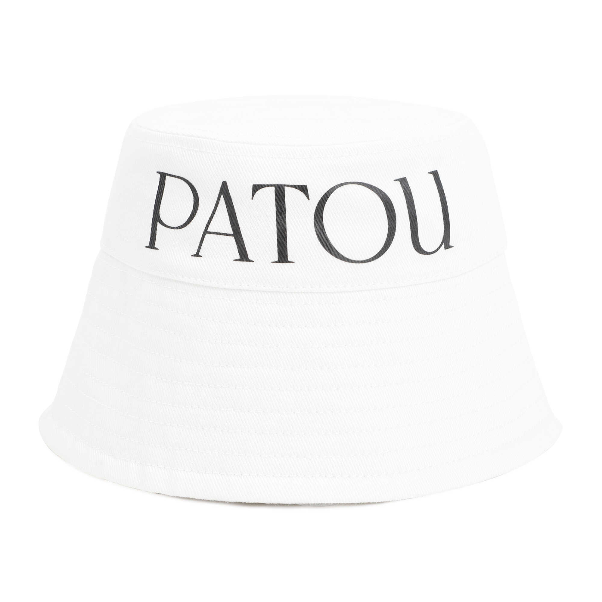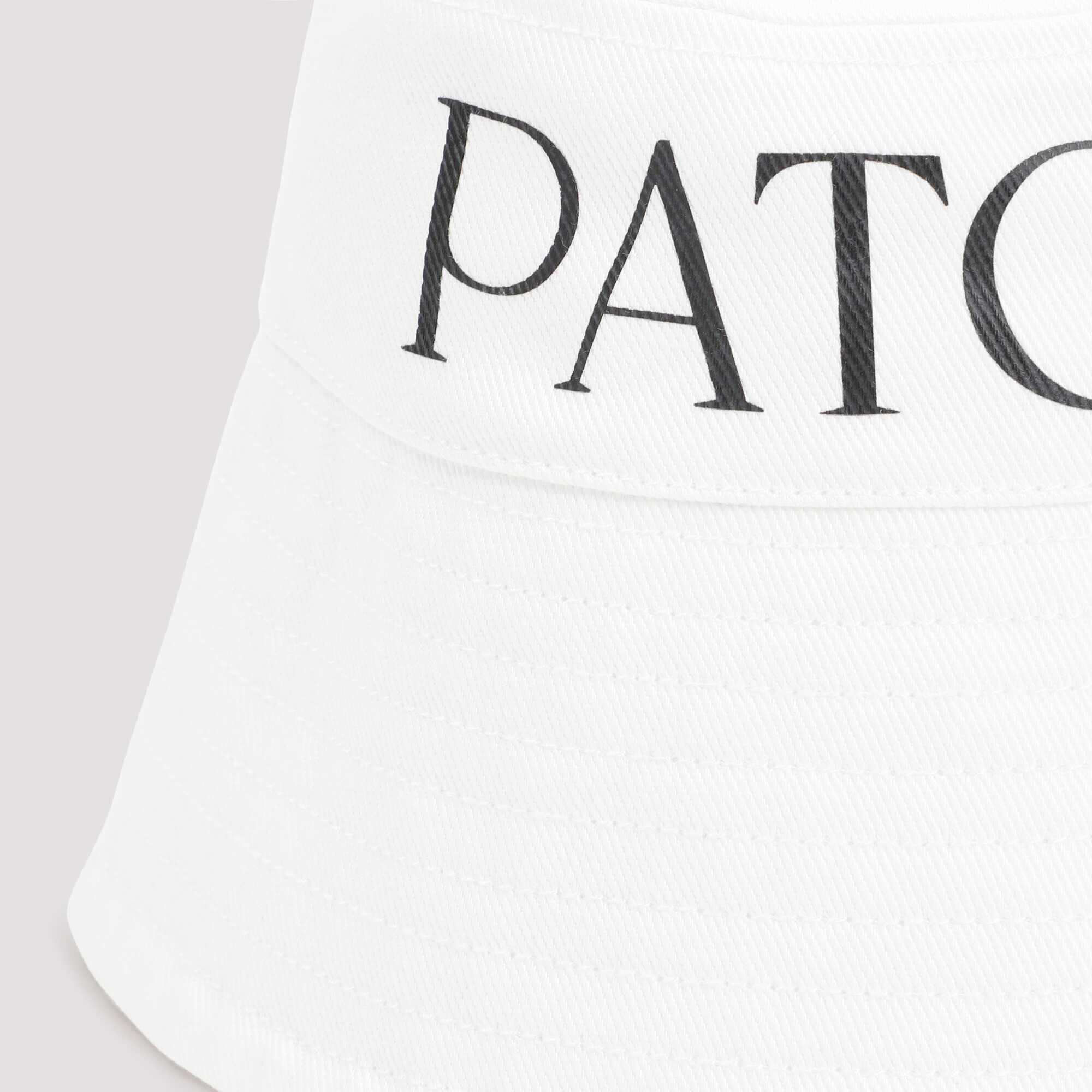 Patou White Logo Print Bucket hat. White cotton, contrasting logo on side, tonal stitching and flexible brim.