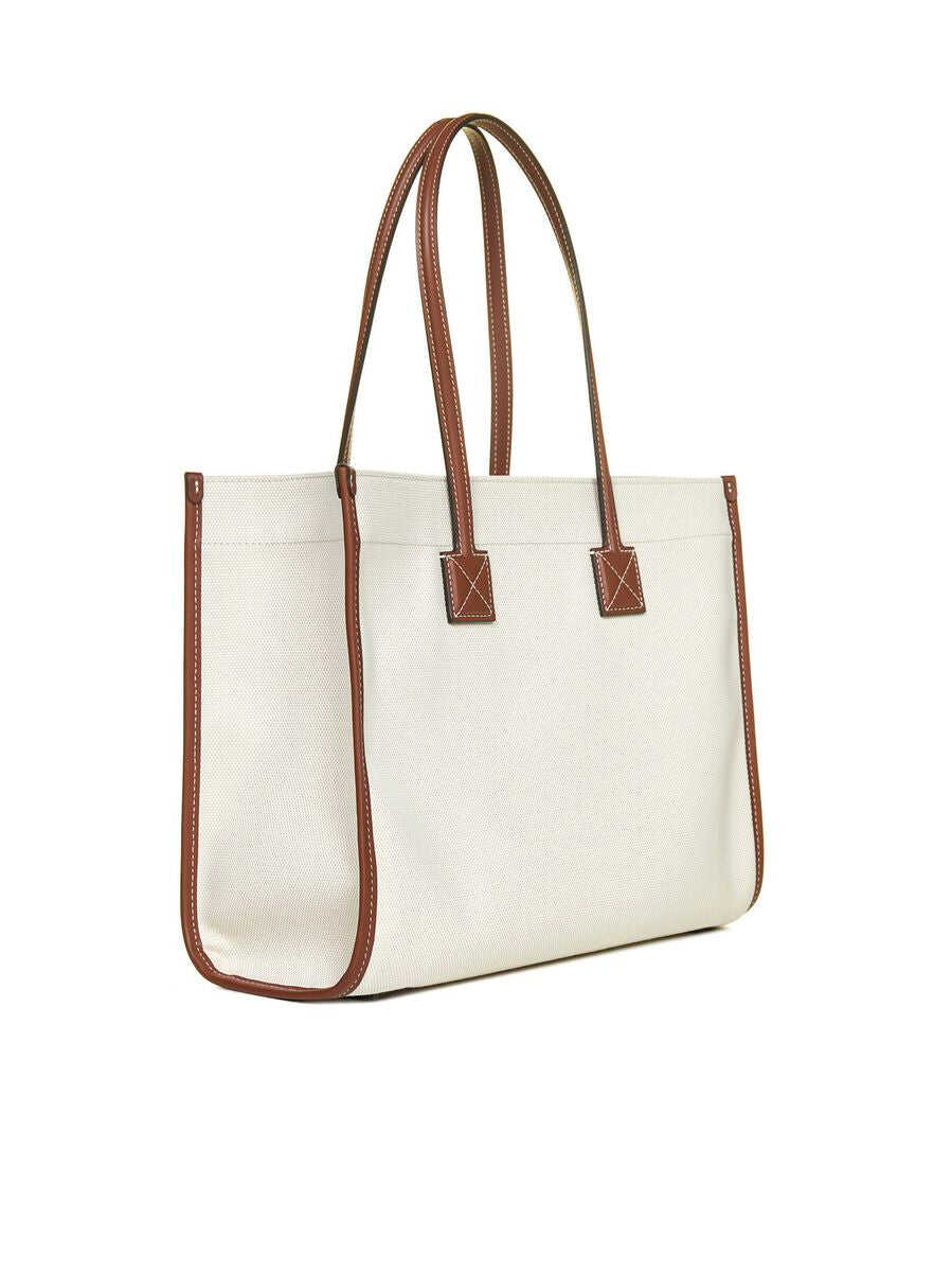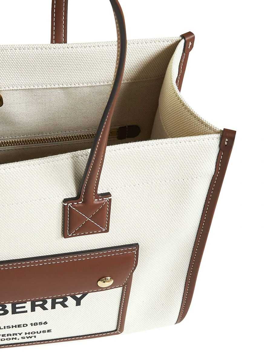 Cream canvas and brown leather Freya tote bag from Burberry featuring logo print to the front, contrasting trim, two rounded top handles, front flap pocket, internal zip pocket and internal card slot.