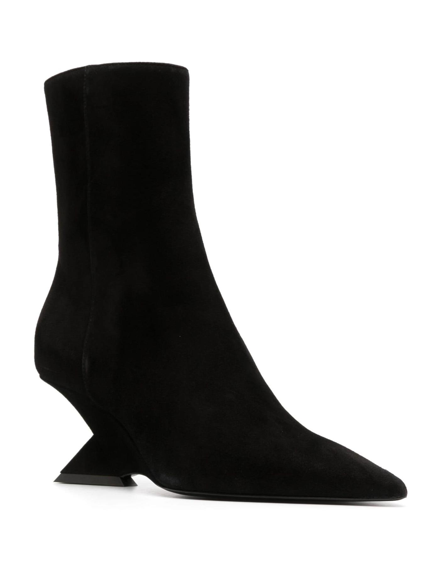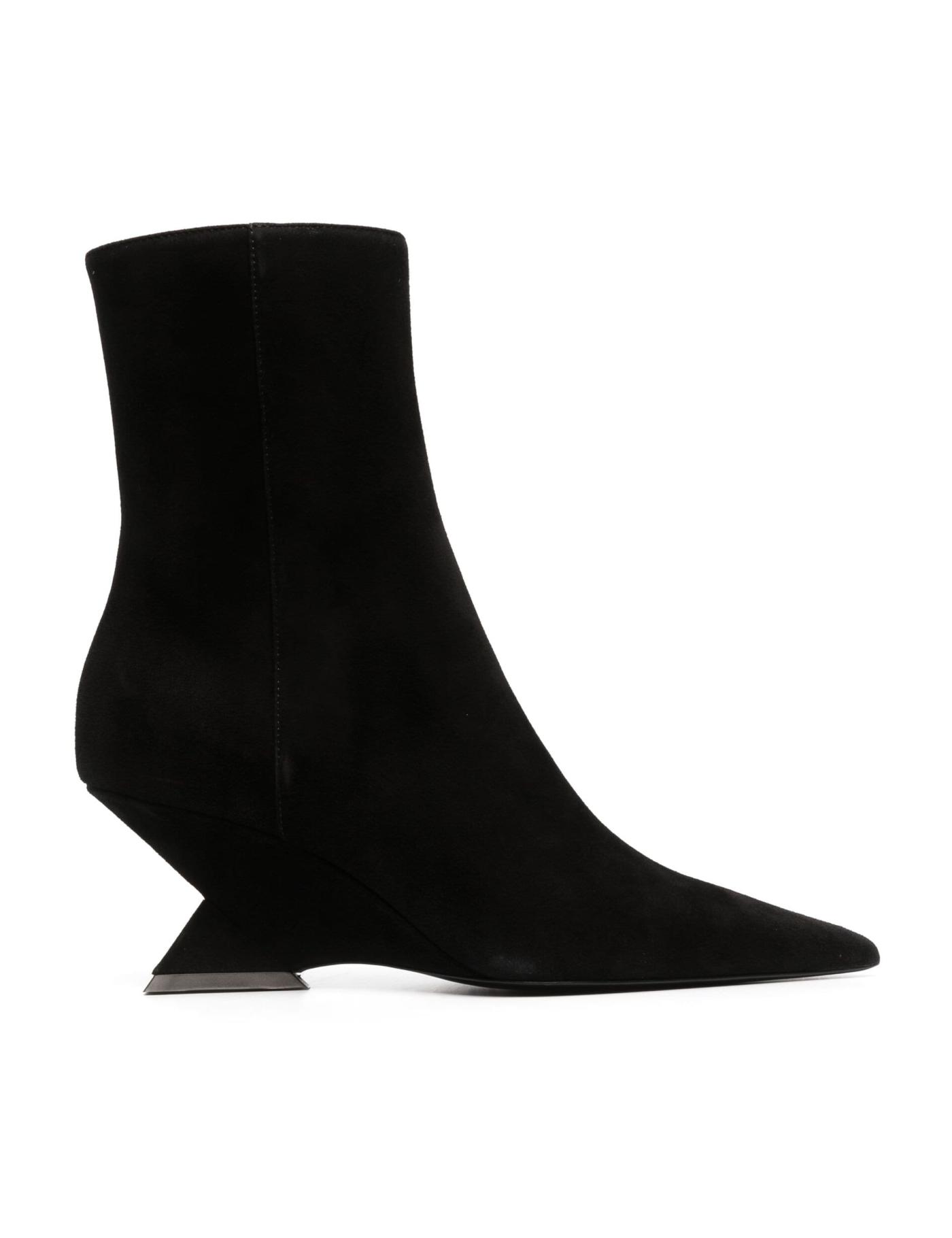 The Attico's signature Cheope heel, characterized by its slanted and sleek silhouette, names and adorns these ankle-high boots. In black leather, the shoes are made even edgier thanks to their pointed toe.