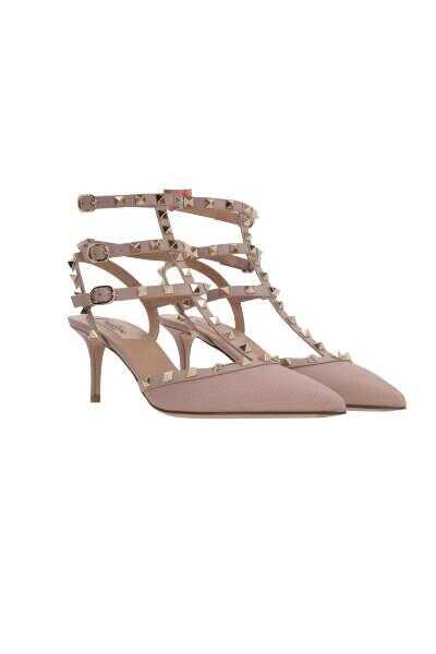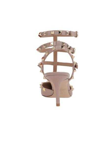Valentino Garavani's slingbacks crafted in powder pink grained leather with tone-on-tone nappa adorned by signature platinum-tone metal studs. Featuring triple ankle-strap with metal buckle, a point-toe silhouette, leather lining and leather sole. The design is completed by a leather-covered midi heel.