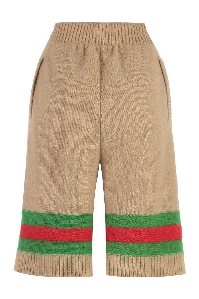 Interlocking G patch knit shorts from Gucci featuring caramel brown, mohair-wool blend, signature Interlocking G logo, signature Web-stripe trim, knitted construction, ribbed trim, high waist, two diagonal pockets to the sides and knee-length.