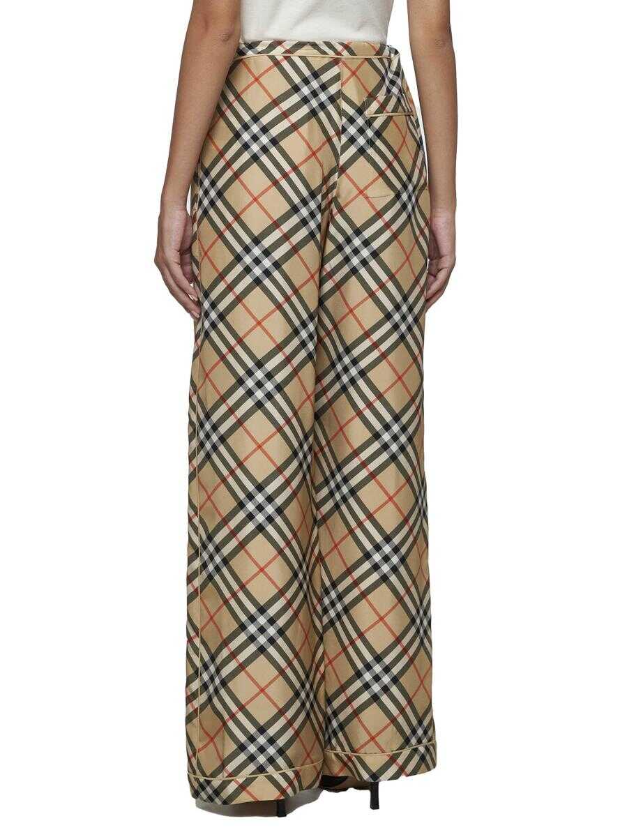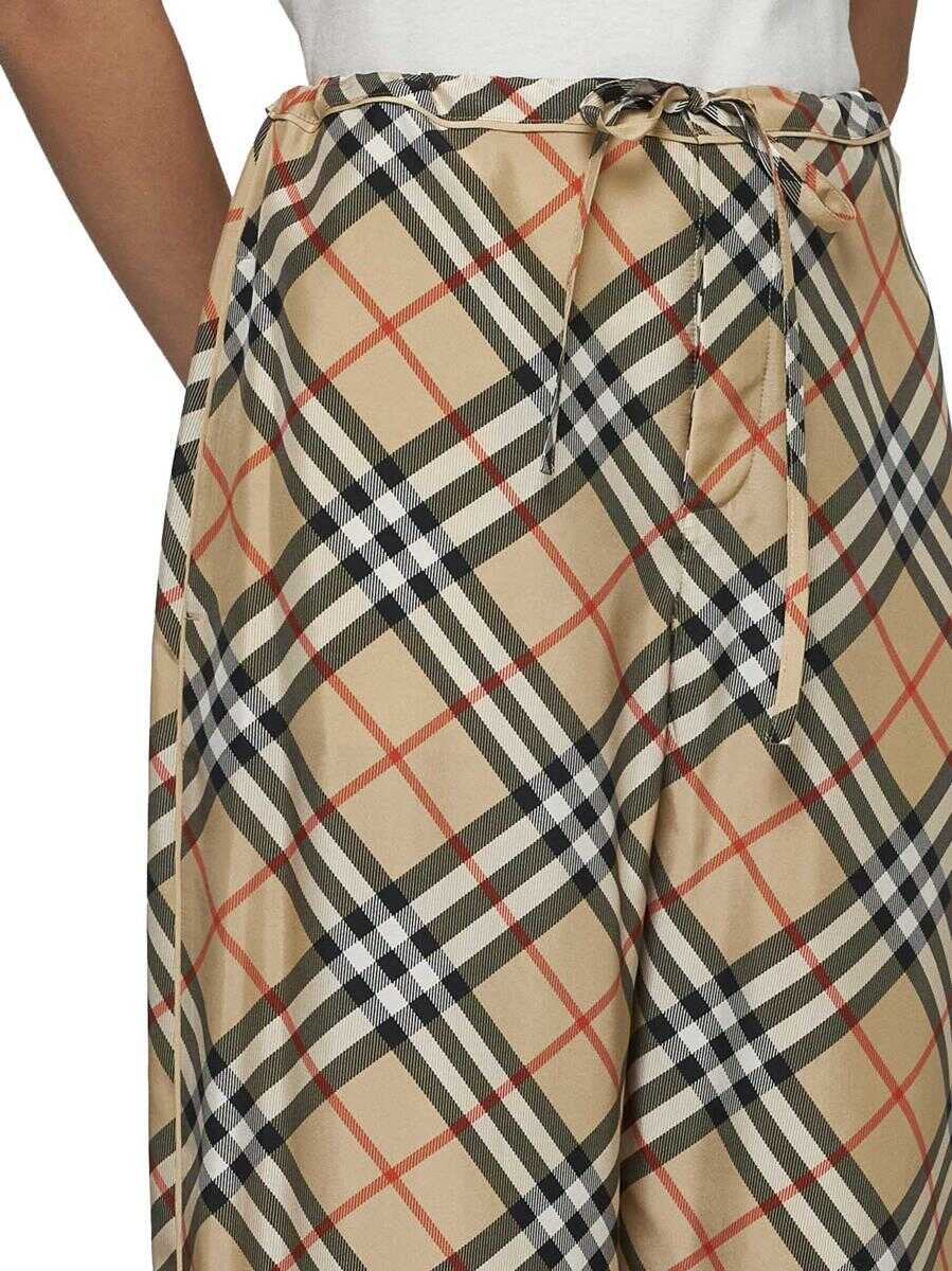 Burberry’s silk pajama-style trousers featuring iconic check print in sand tones, adjustable drawstring at the waist, button and zip fly, side pockets, back pocket, wide leg and tone-on-tone piping.