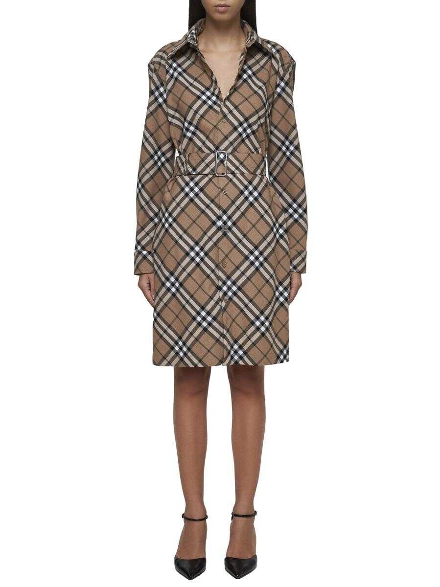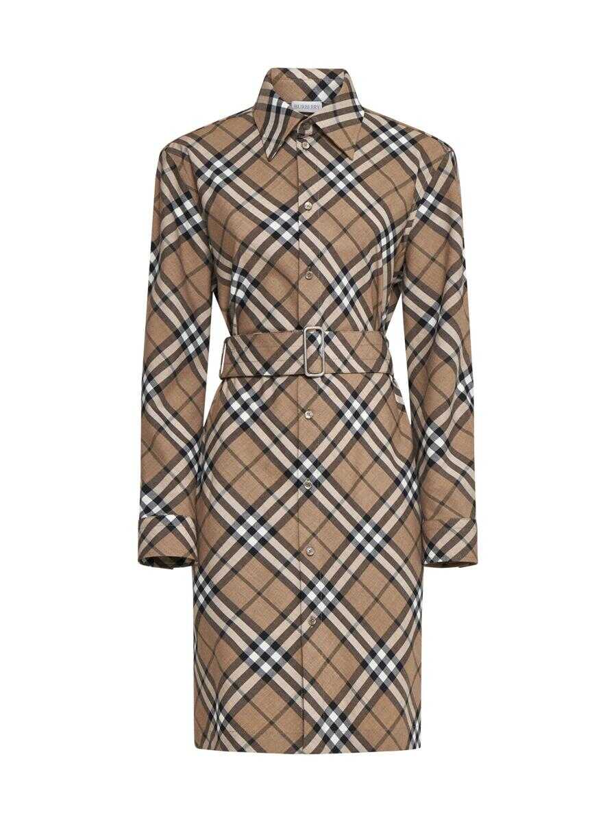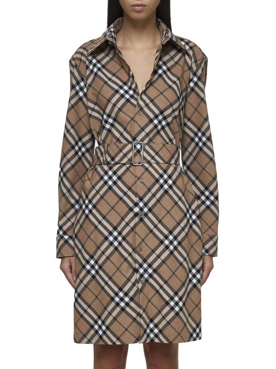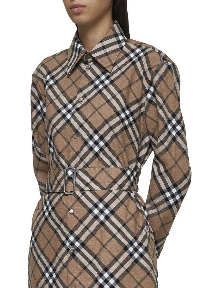 Burberry's wool blend shirt dress featuring iconic check print in shades of tan, pointed collar, button fastening at the front and cuffs, front belt with B-logo buckle, back waist with cut-out and elasticated gathers and straight fit.