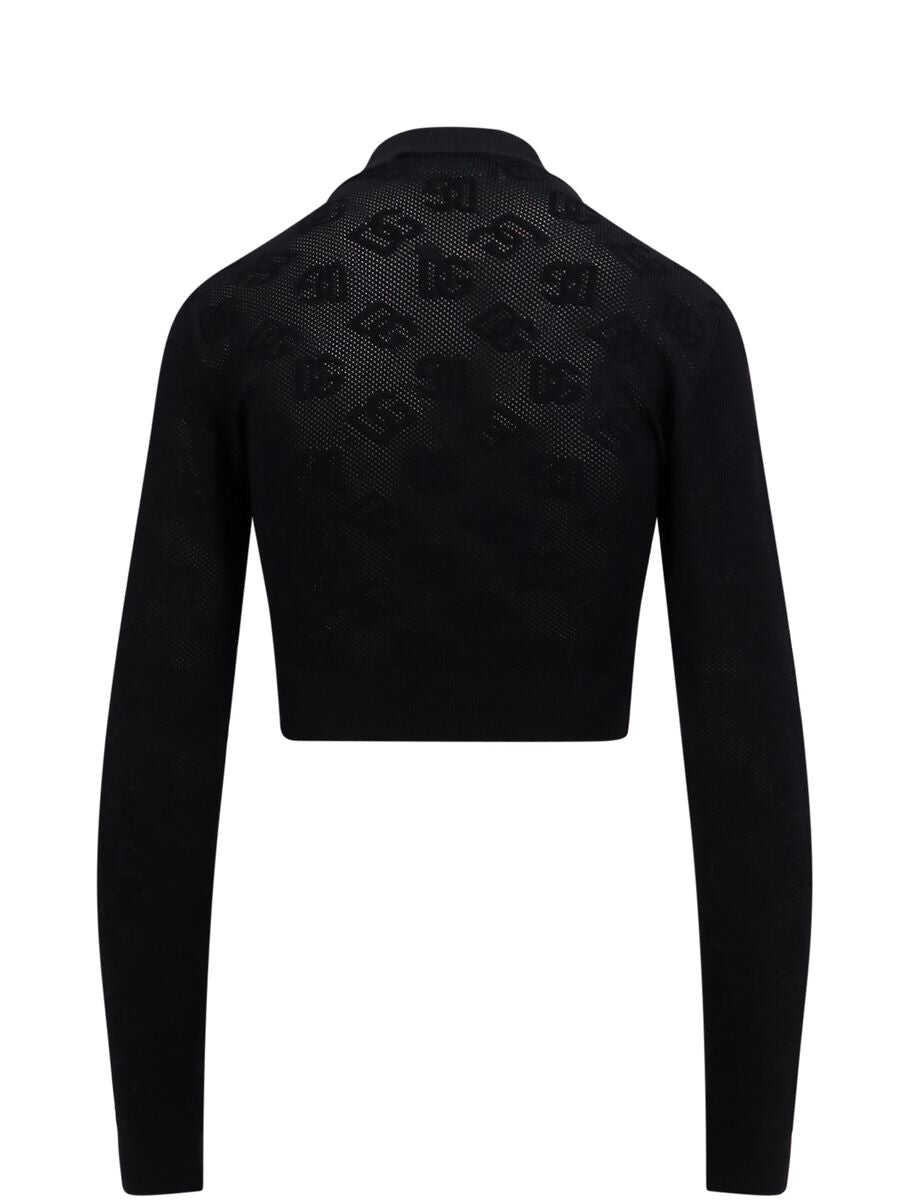 Black viscose blend top from Dolce & Gabbana featuring crew neck, long sleeves, open knit, all-over logo print, ribbed cuffs and hem and straight hem. Size Type: Woman IT