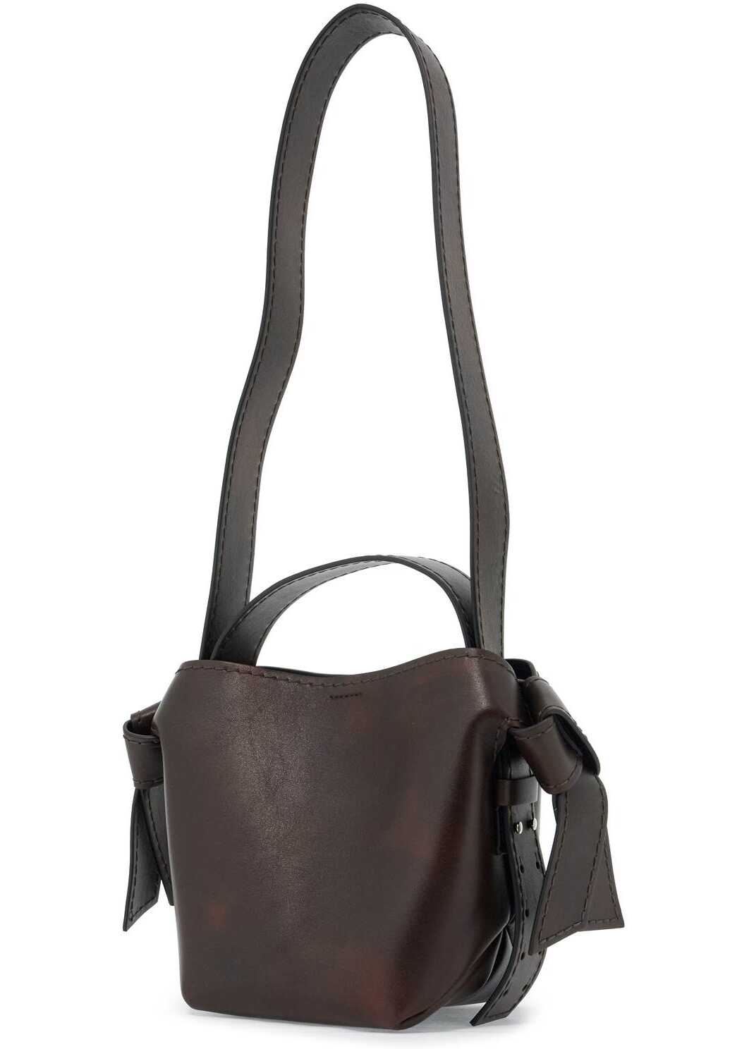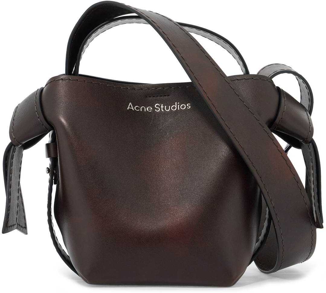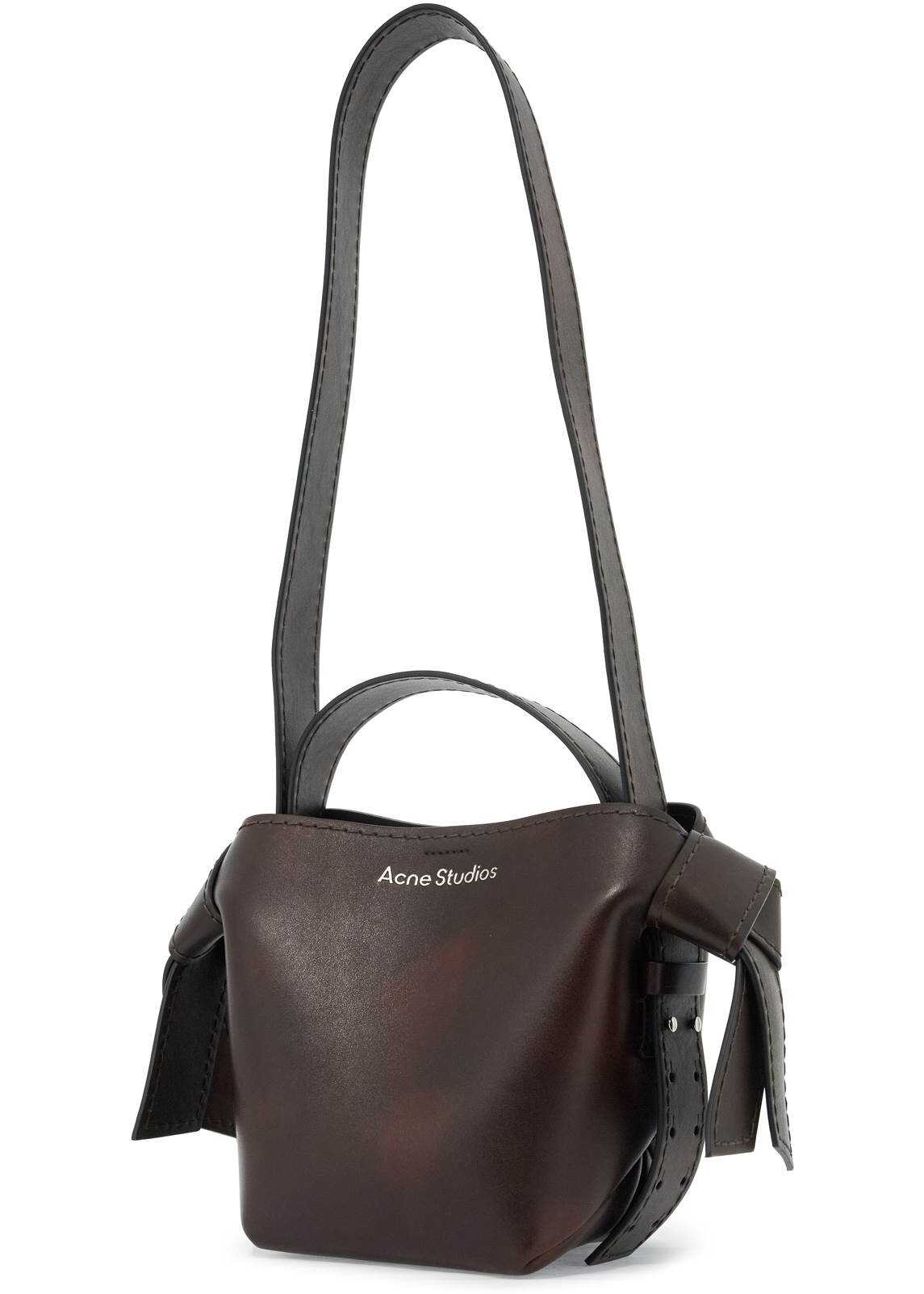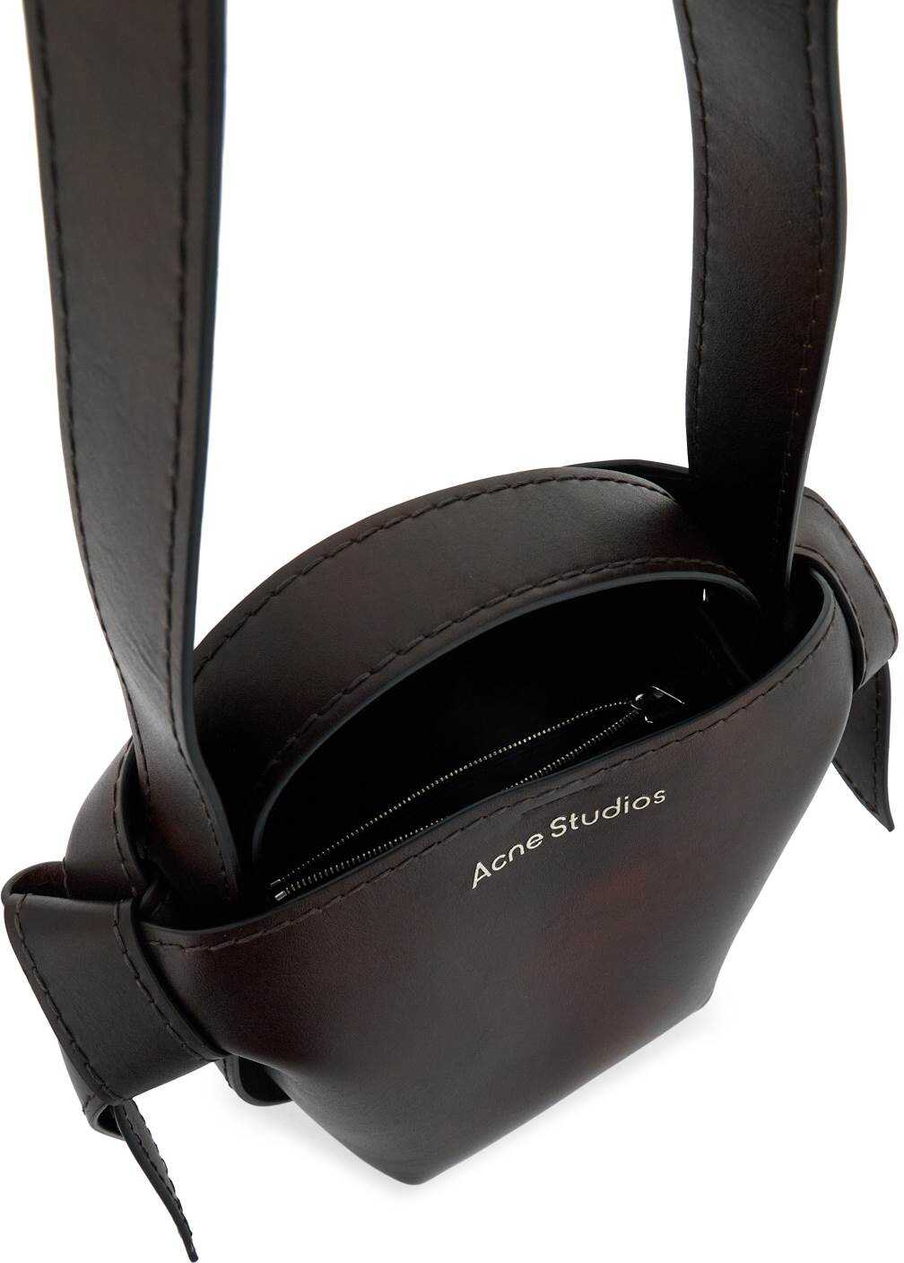 Musubi Mini smooth leather bag by Acne Studios, featuring side knots inspired by the Japanese Obi Sash. Single handle, adjustable and removable shoulder strap, magnetic button closure, embossed logo, one logoed inner zip pocket.