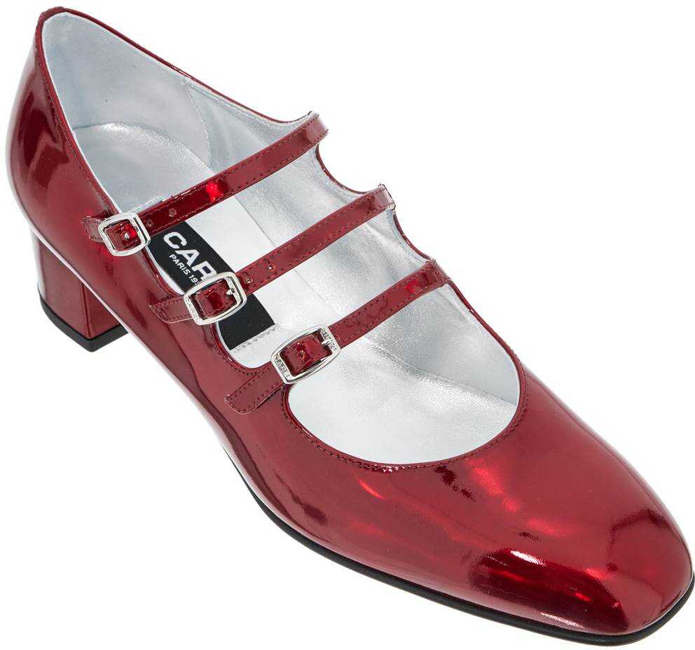 The Mary Jane 'Kina' by Carel are made of metallic leather and feature three adjustable straps. They have a wide heel, square toe, leather insole, and leather sole.
