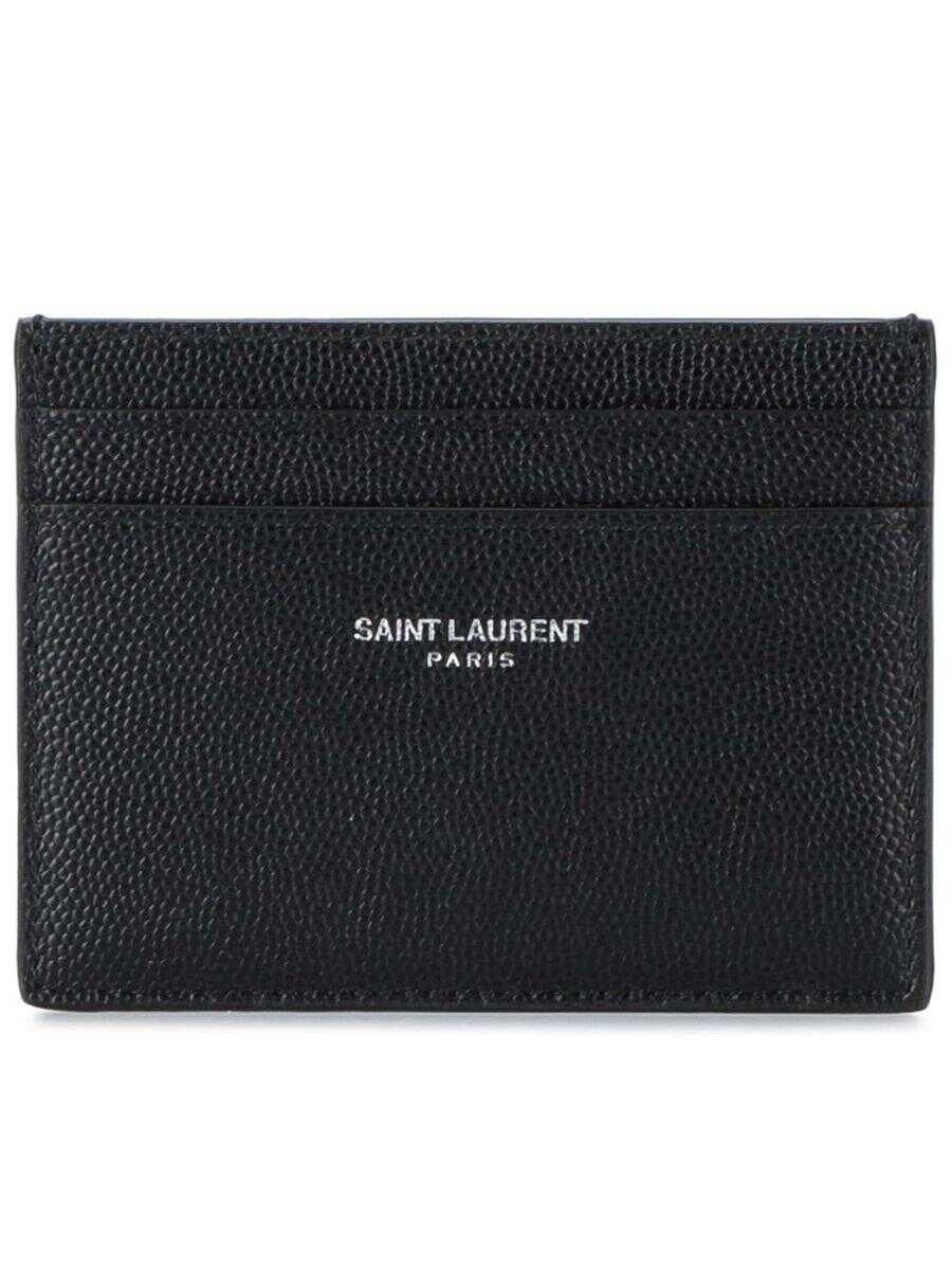 This elegant card case from Saint Laurent Paris is made of black textured calfskin leather, without metal, and features the Saint Laurent signature imprinted.