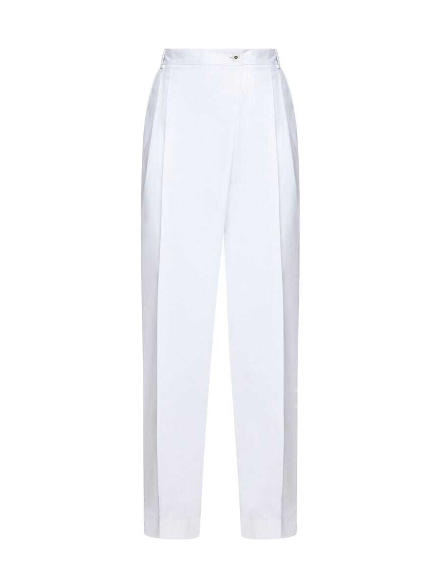 Dolce & Gabbana’s white cotton trousers featuring high waist, belt loops, front zip and button wrap style fastening, side pockets, back welt pockets and wide leg with double pleats and ironed crease.