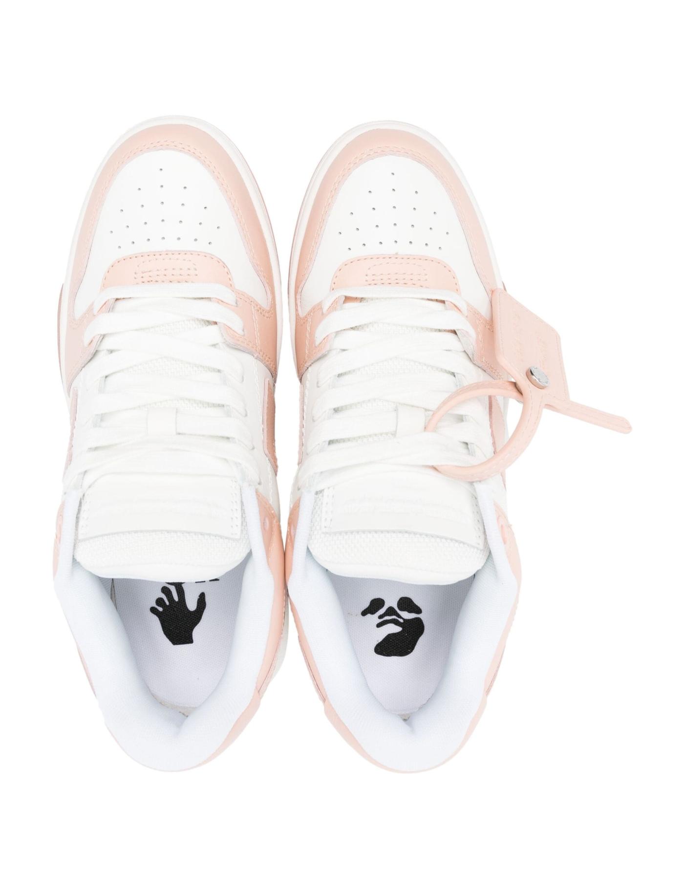 These Out of Office sneakers from Off White are a playful take on footwear. Finished with signature arrows and luggage tag detailing, the blush pink and white leather pair boast a low-top silhouette atop a ridged rubber sole.