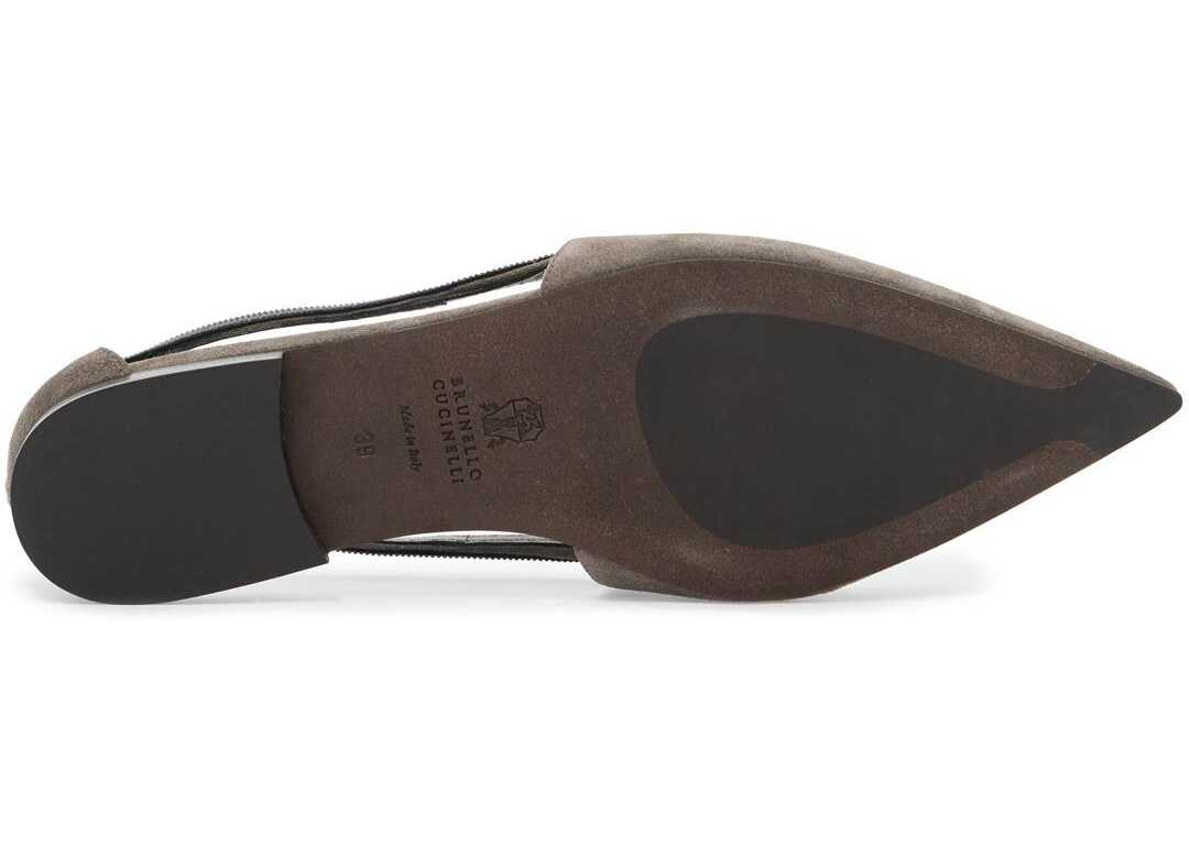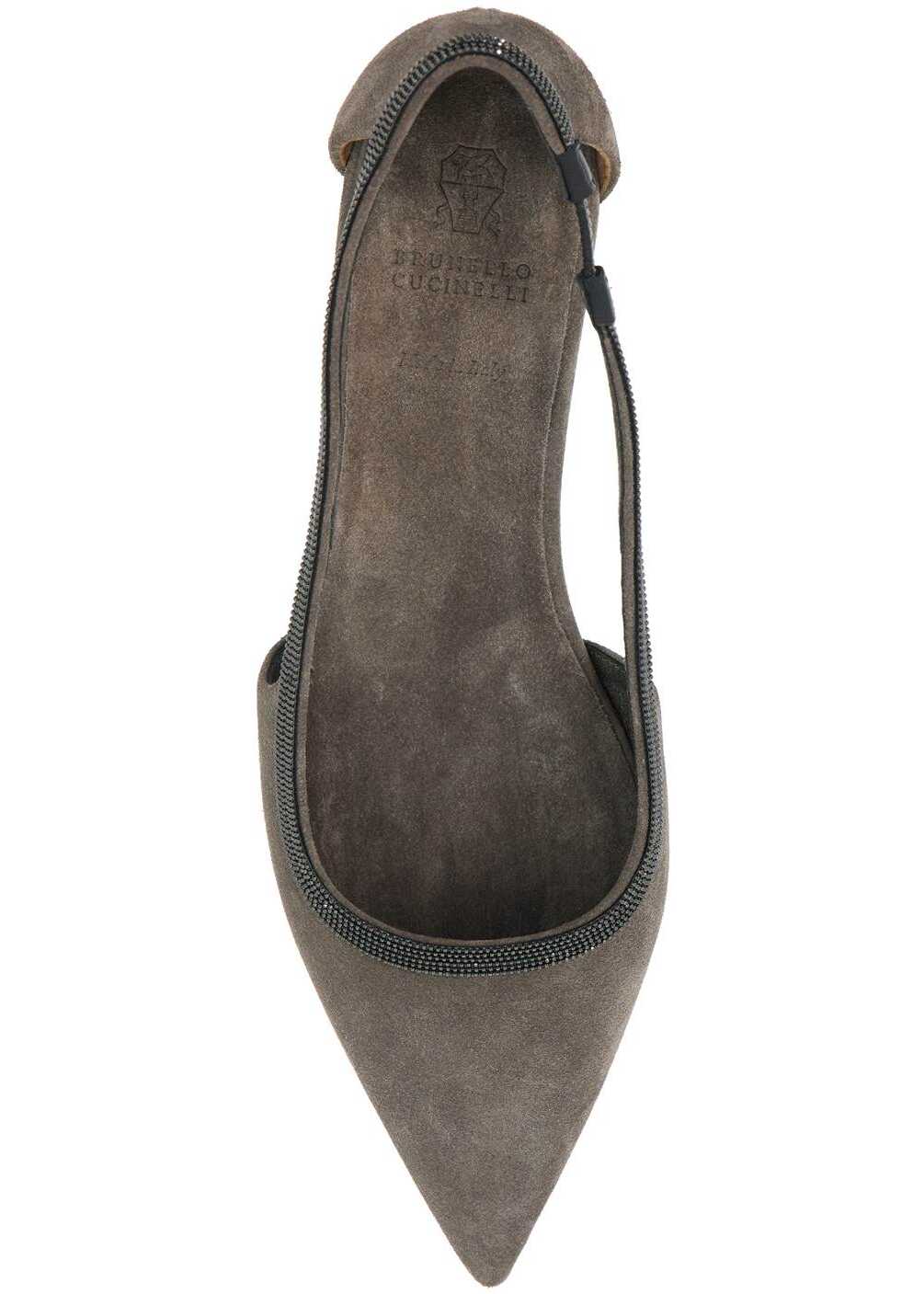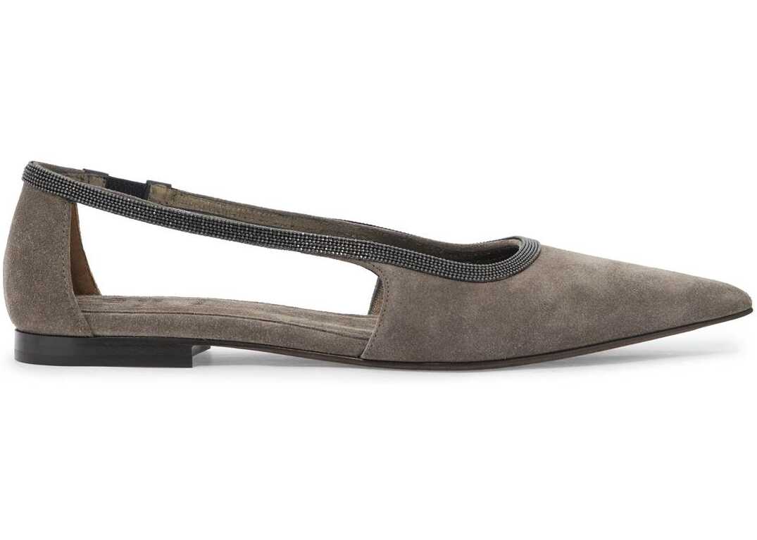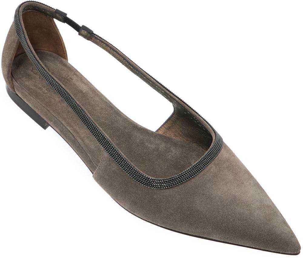 These Brunello Cucinelli ballerina flats are made of suede leather with a pointed design and cut-out details, embellished with a band embroidered in rows of precious monile. The suede insole and leather sole feature a rubber inlay for added comfort.