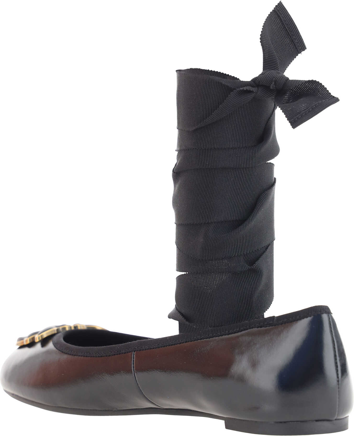 Lçeather Gioia Ballerinas by Pinko, shiny design, ankle lap embellished with ribbon to tie, almond toe, iconic Love Birds plaque on back of foot.