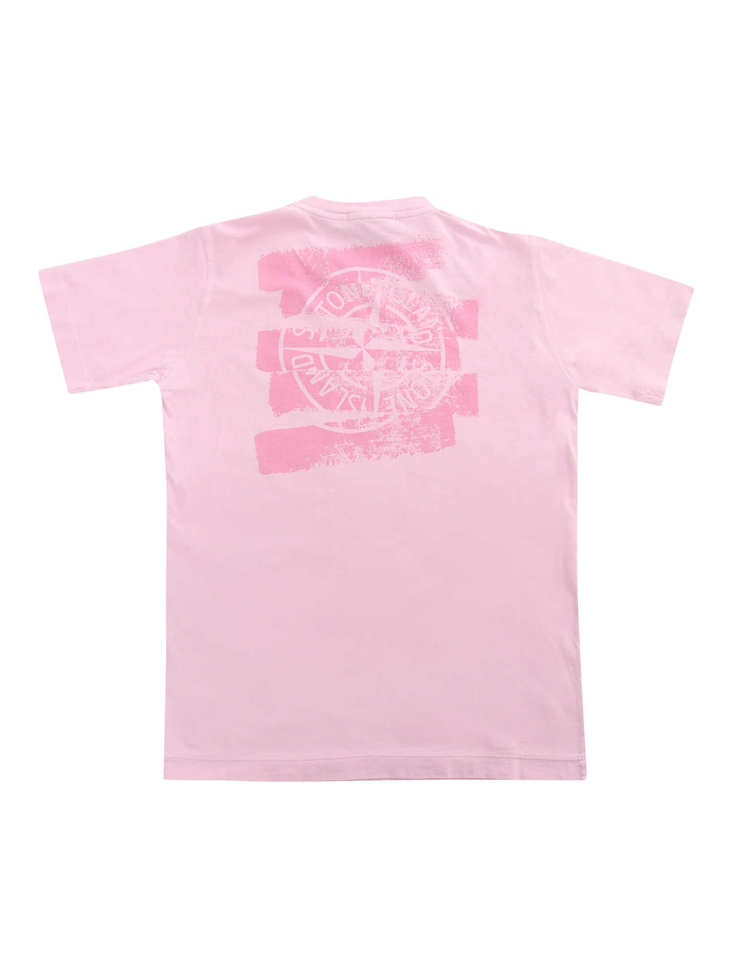 Stone island pink cotton t-shirt for children with logo print and drawings on the back and front.