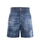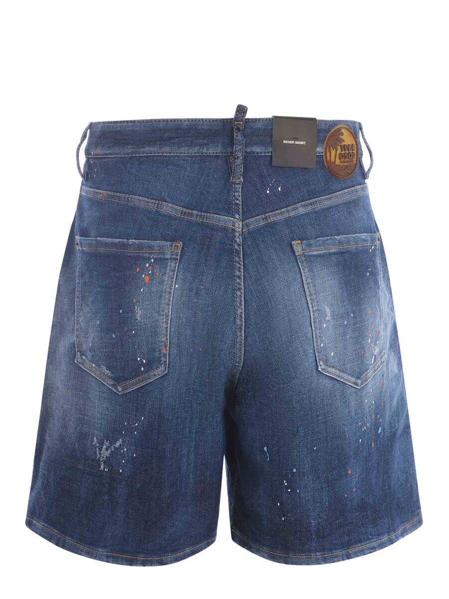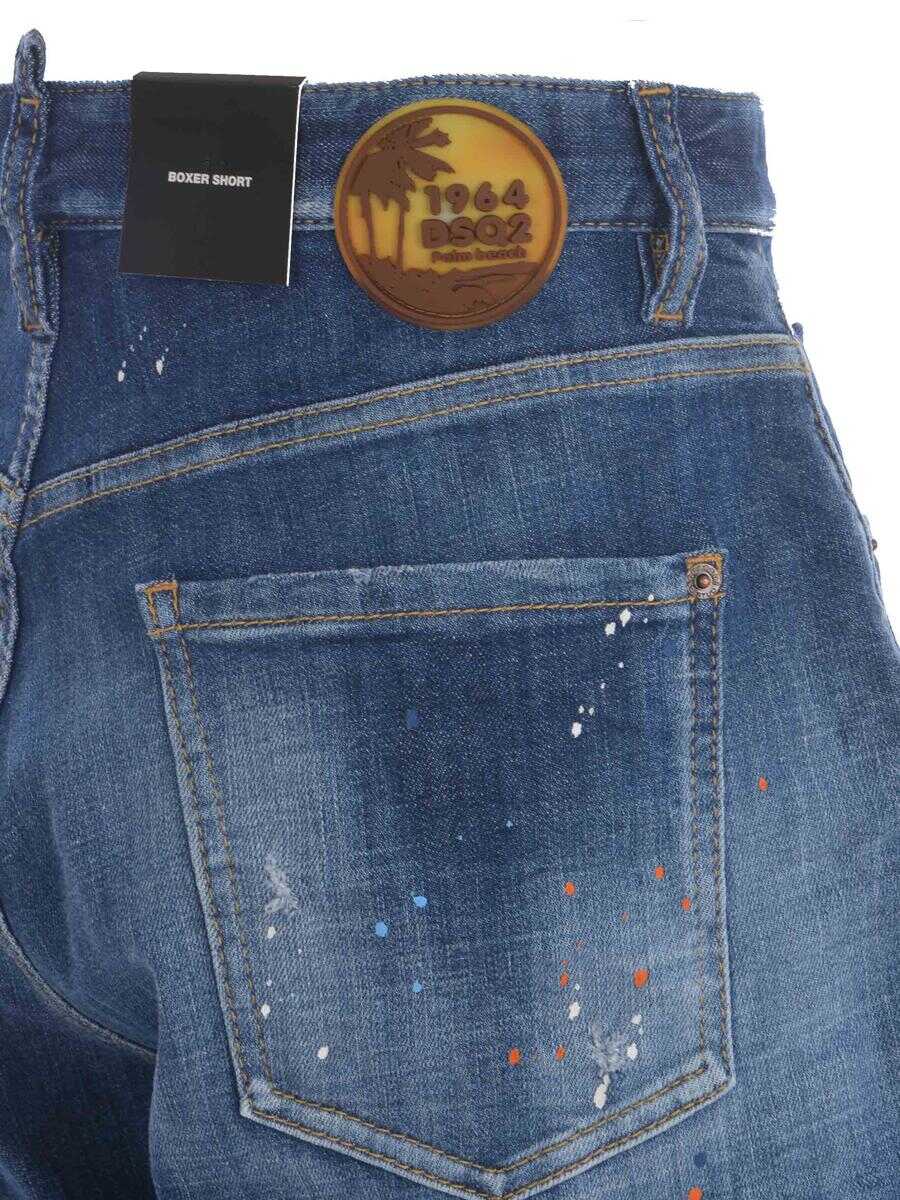 Shorts Dsquared2 "Boxer" made of Light Blue denim. Stone wash effect. Microcrack. Splashes of contrasting paint Orange, Light Blue, White. Five pockets. Button closure. Contrasting logo patch applied on the front. Logo patch applied on the back.