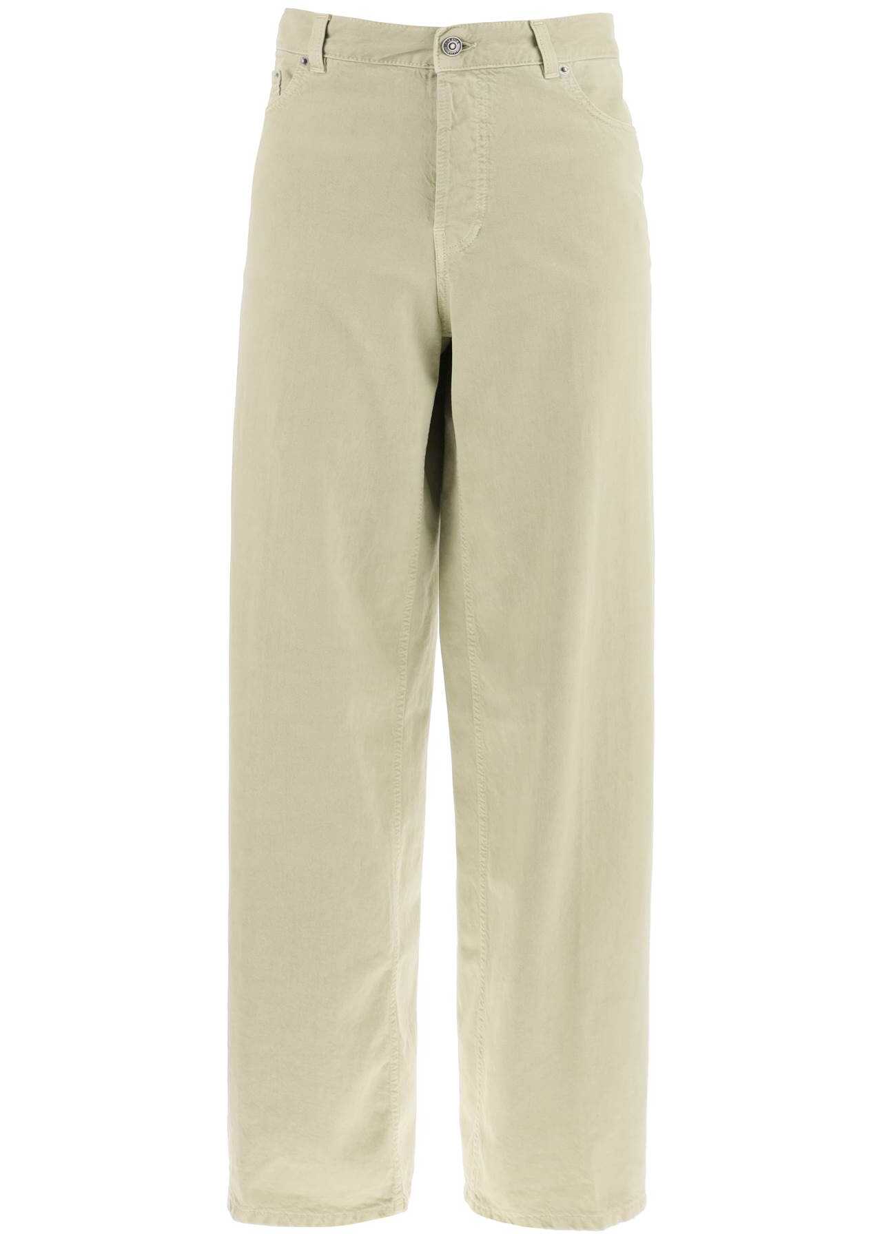 Haikure pants with a five-pocket design, made of cotton and linen drill with a loose fit. It features hidden button closure, belt loops, and a back jacron. The model is 177 cm tall and wears size 26.