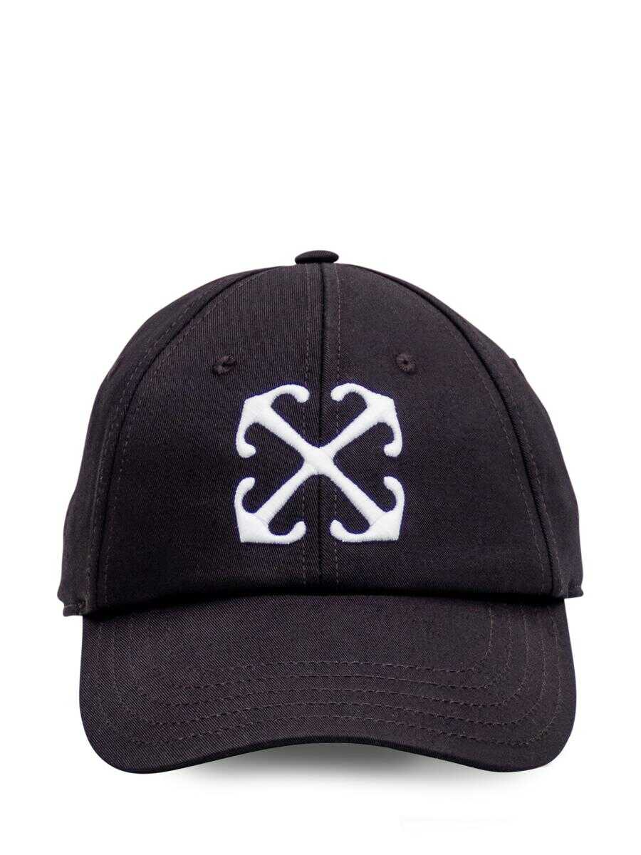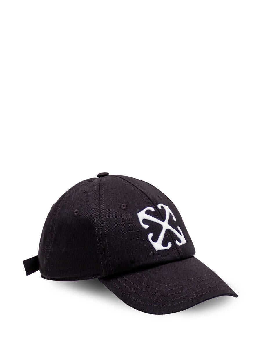 Black cotton hat with visor. Adjustable strap at back. Arrow motif on the front.