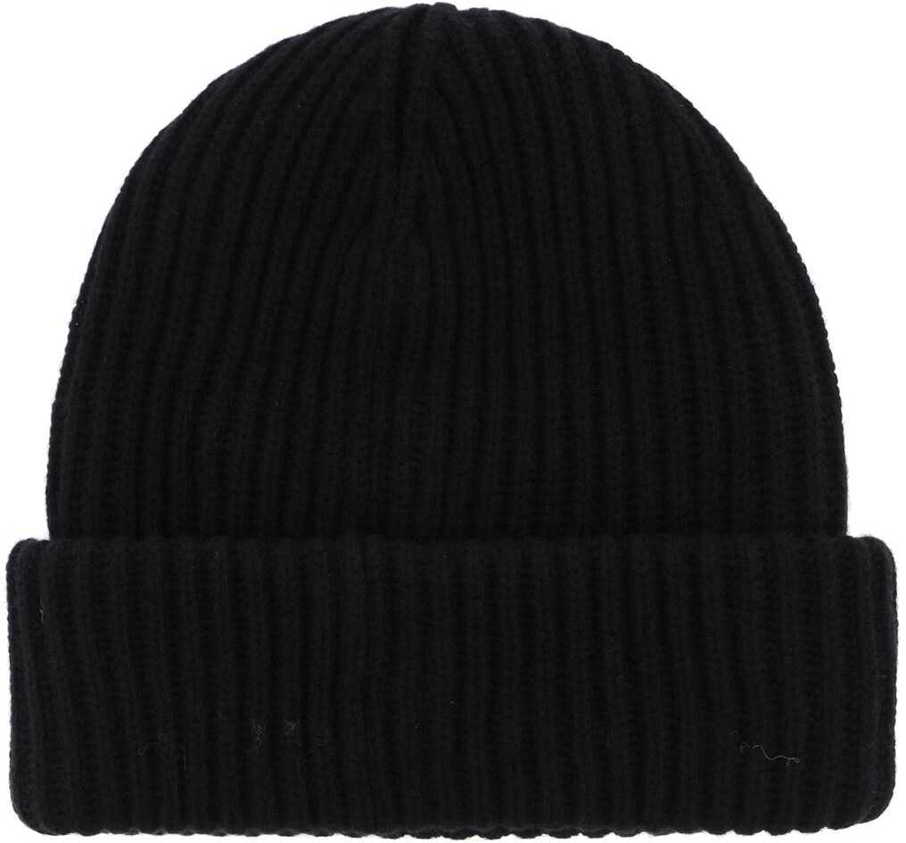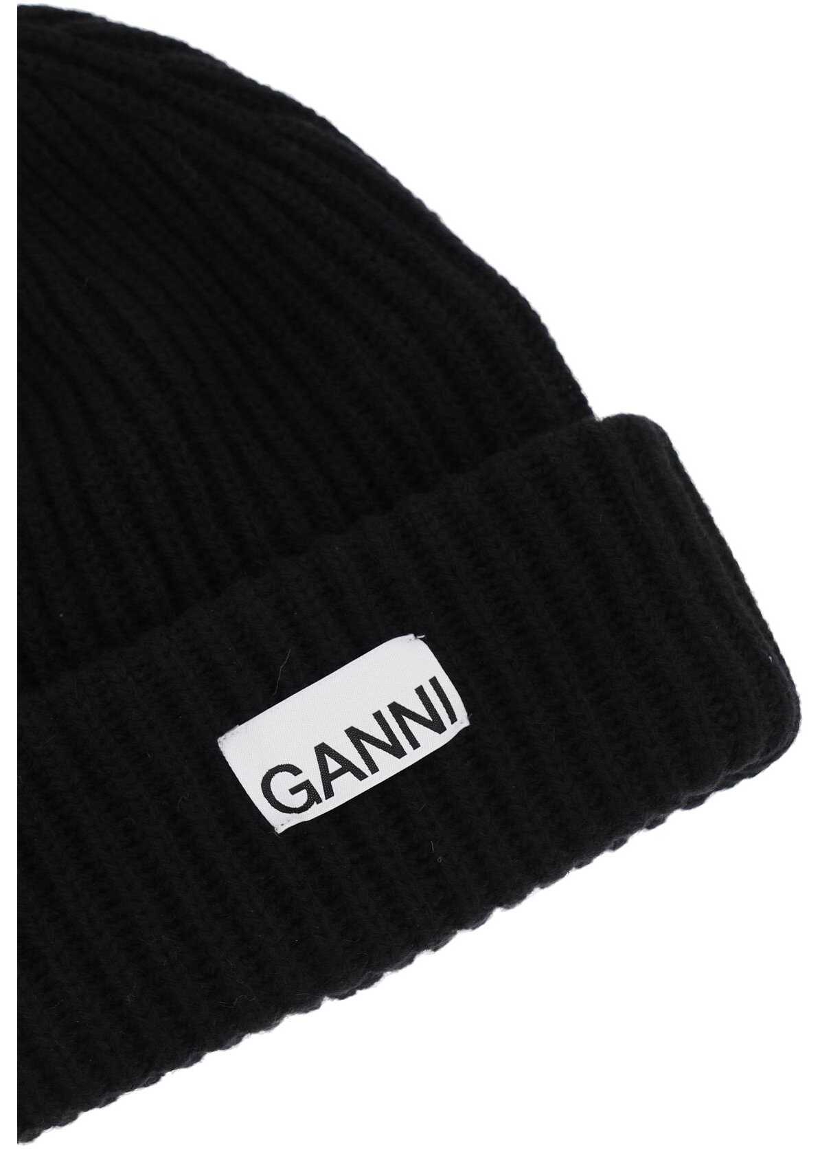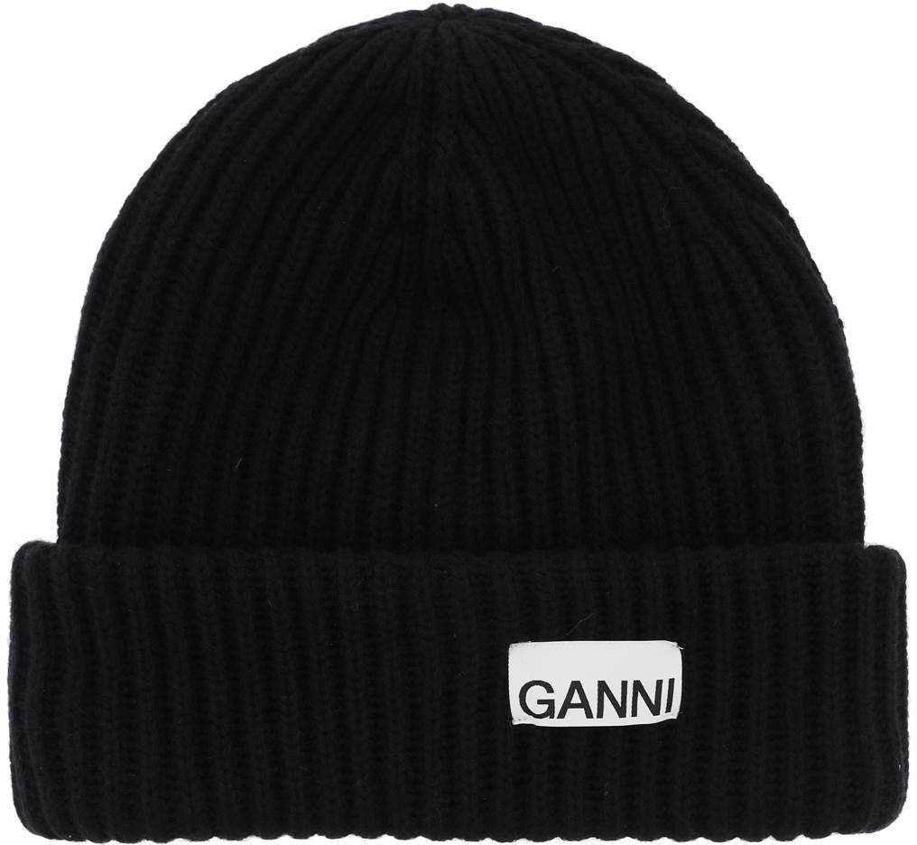 Beanie hat by Ganni crafted in ribbed mélange recycled wool blend knit with a fabric logo patch applied on the turn-up. One size fit all.