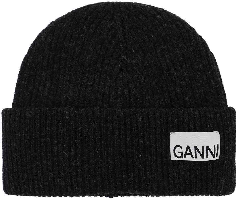 Beanie hat by Ganni crafted in melange-effect recycled wool-blend ribbed knit, with turn-up hem embellished with logo label on the front. One size.