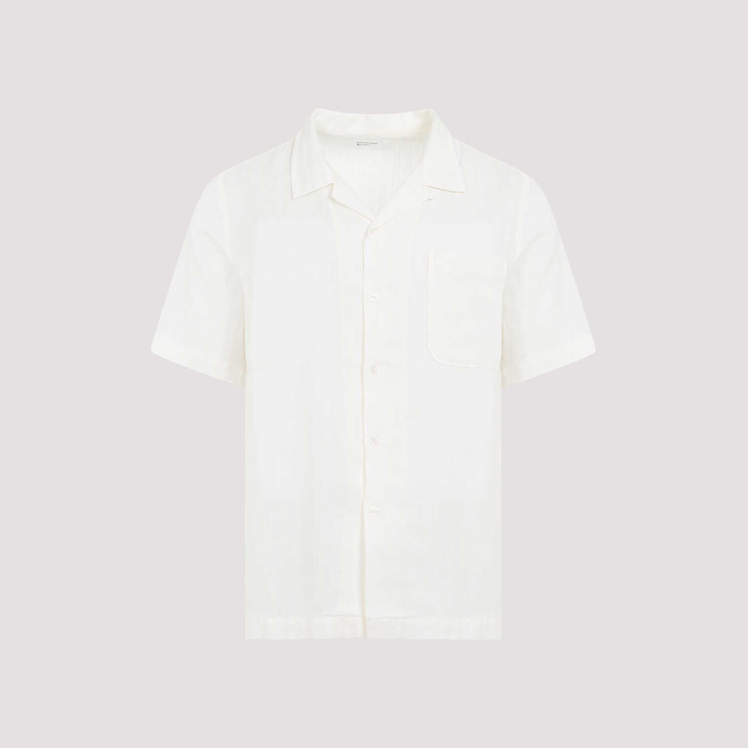 Universal Works Ecru Cotton Shirt. Ecru cotton, short sleeves, bowling collar, front button fastening, straight hem, regular fit.