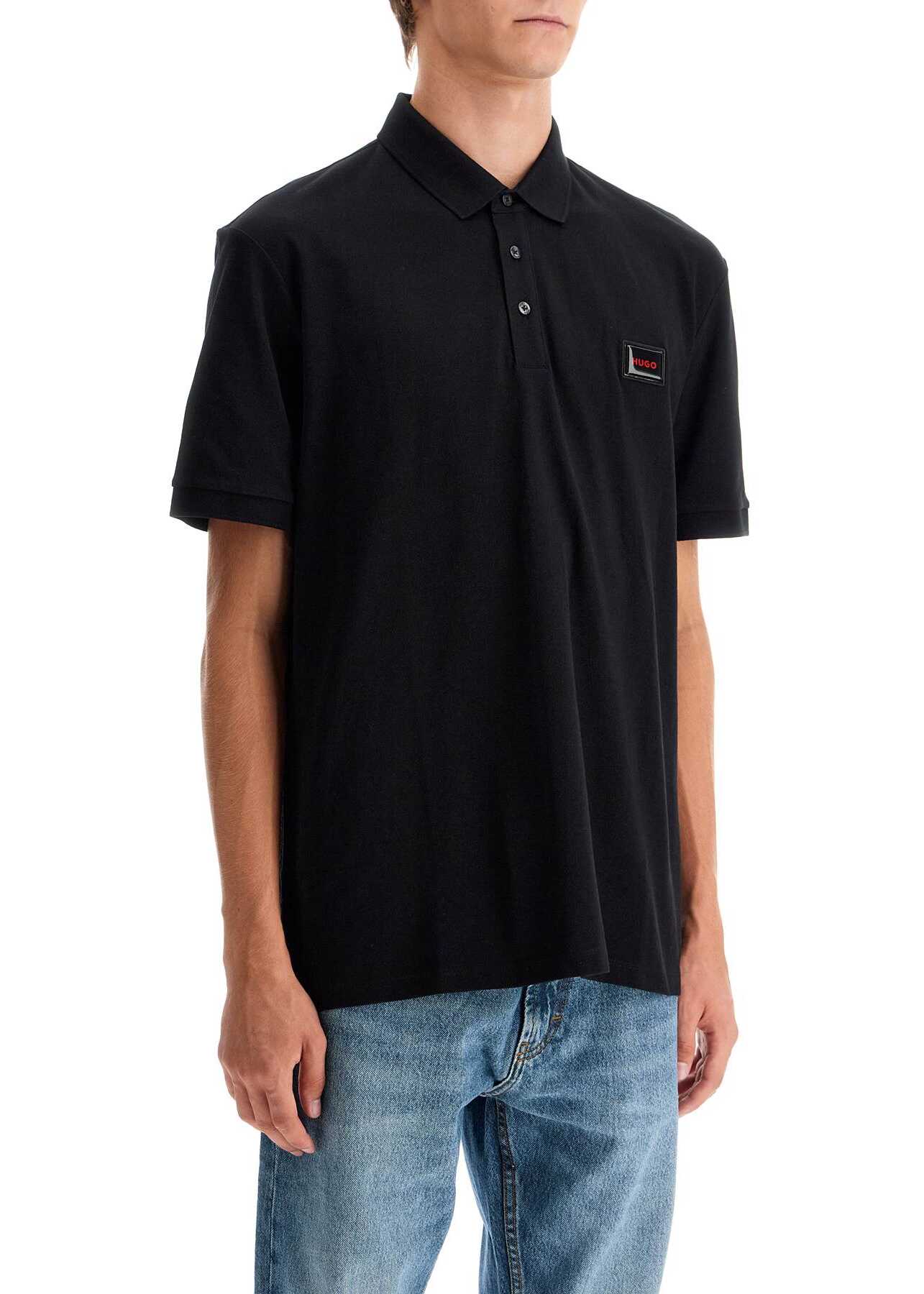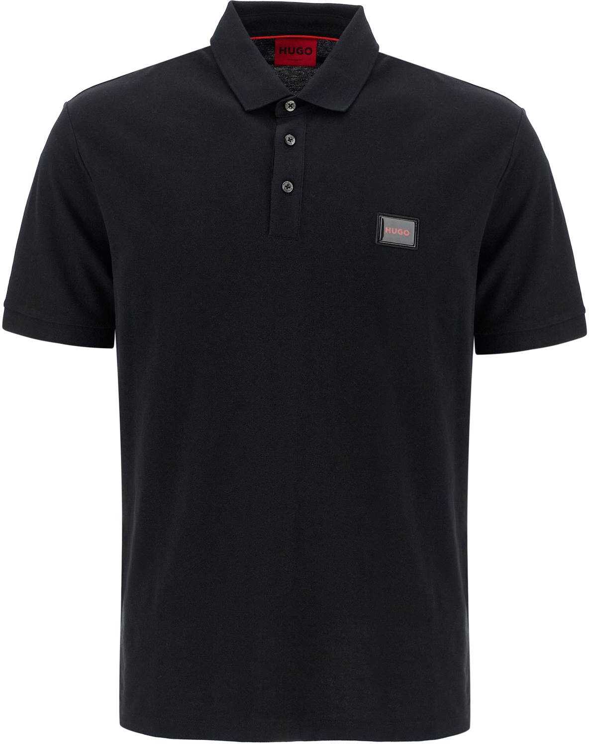 The Hugo short-sleeved polo is made of cotton piqué with a three-button closure and a gel logo patch on the chest. It features ribbed collar and sleeve cuffs, as well as side slits at the bottom. The fit is regular. The model is 187 cm tall and wears size L.