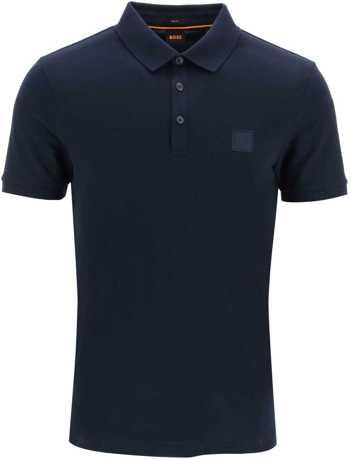 Short-sleeved Boss polo made of lightweight stretch cotton piqué with a logo patch on the chest. It features ribbed collar and sleeve cuffs, and a three-button closure. Slim fit. The model is 182 cm tall and wears size L.
