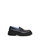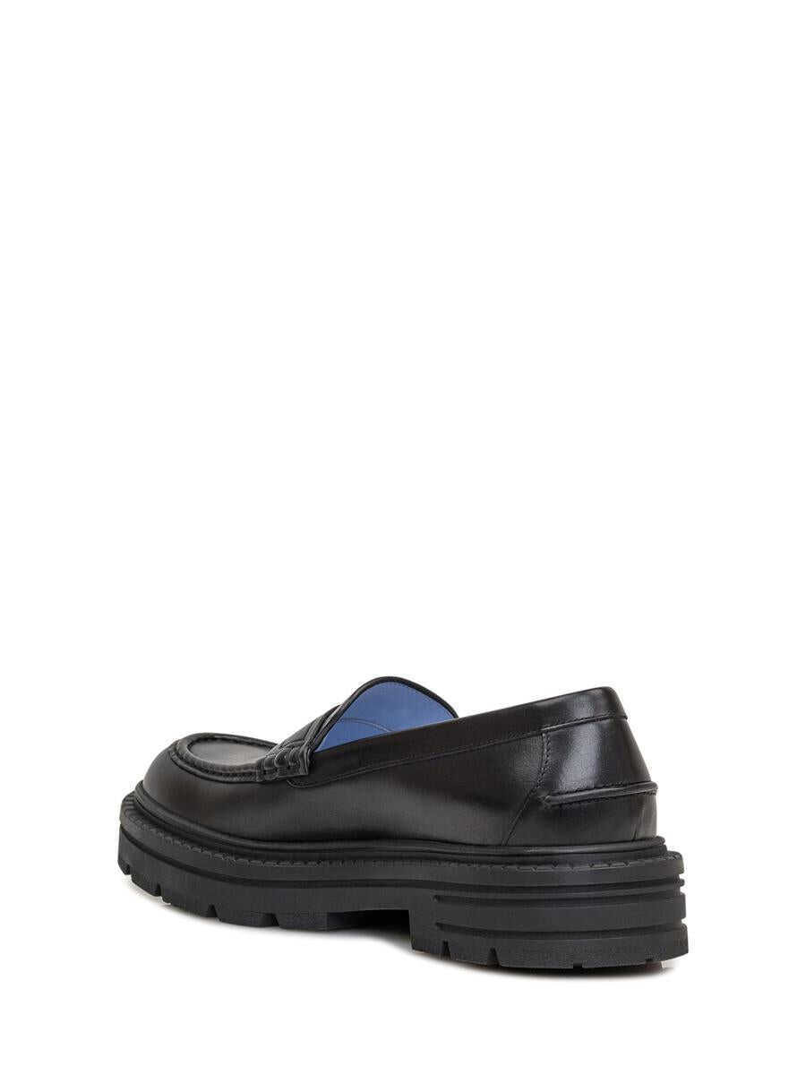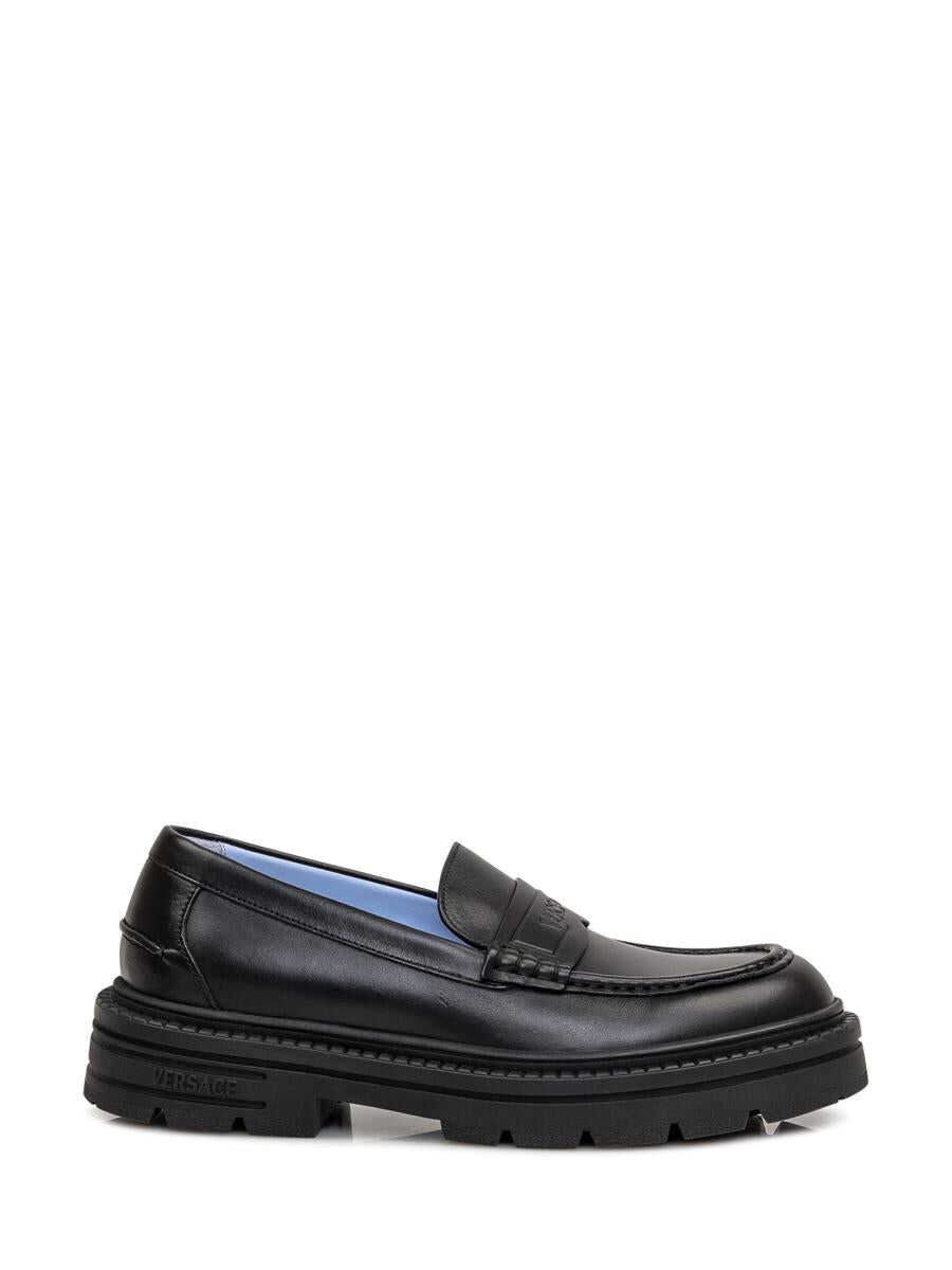 Black leather loafers. Rounded toe. Rubber sole with versace pattern. Engraved logo on front strap. Platform height: 4